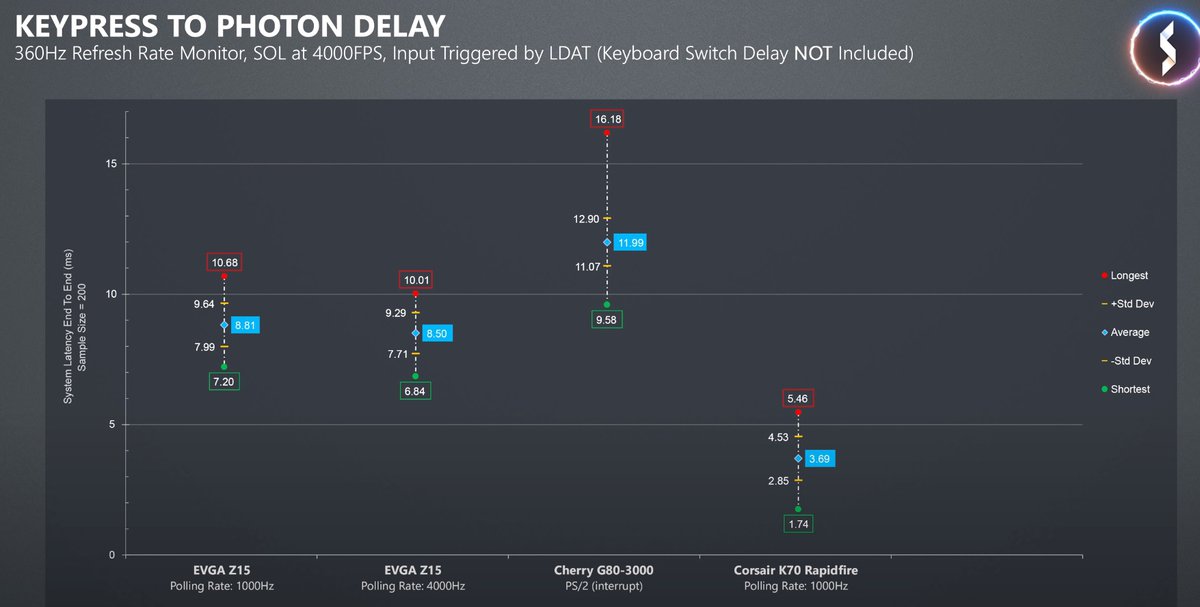 Выяснилось две вещи. Во-первых, при подключении напрямую к плате самой быстрой оказалась 1000-герцовая Corsair K70 Rapidfire, а EVGA Z15 с частотой 1000 Гц и с частотой 4000 Гц показала почти идентичные результаты.