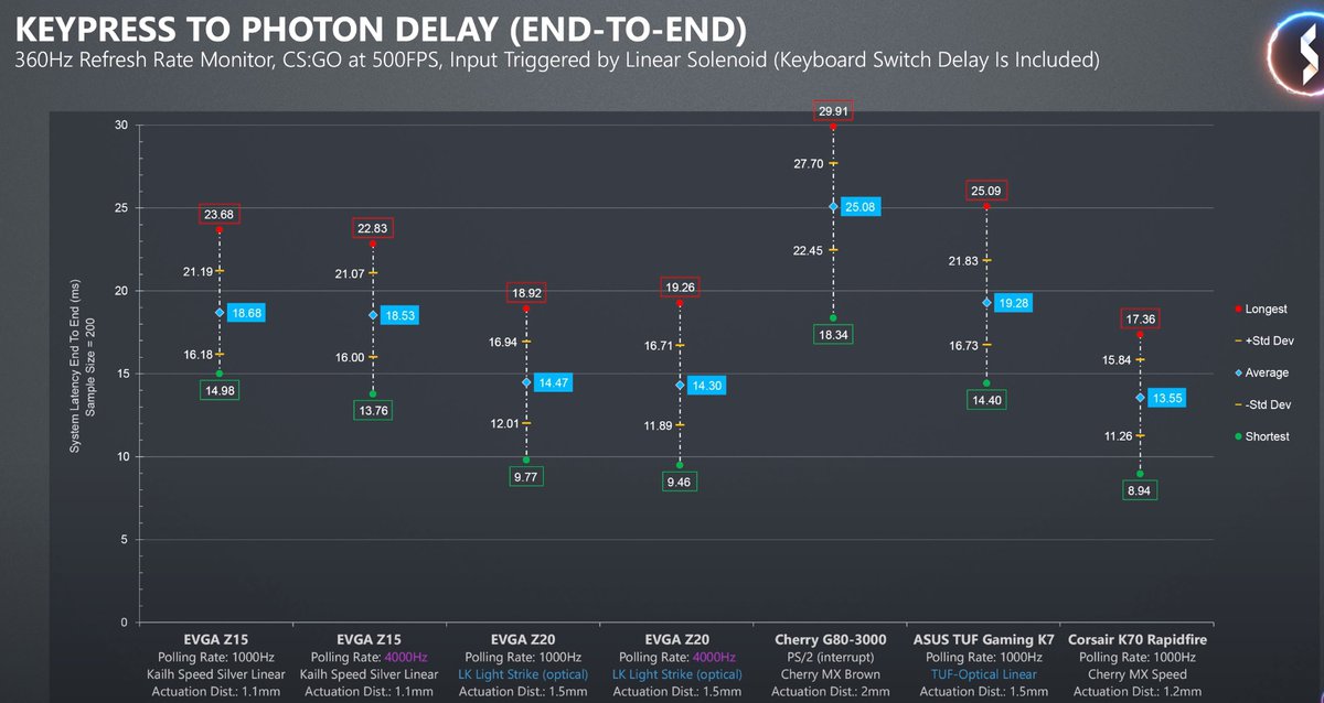 Тестировались клавиатуры EVGA Z15 и Z20, их проверяли в двух режимах: 1000 Гц и 4000 Гц. Параллельно были протестированы клавиатуры Cherry G80-3000, ASUS TUF Gaming K7 и Corsair K70 Rapidfire.
