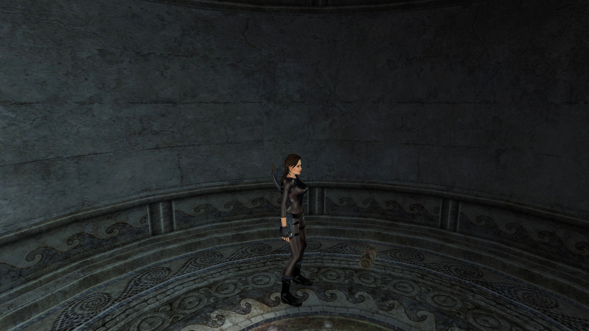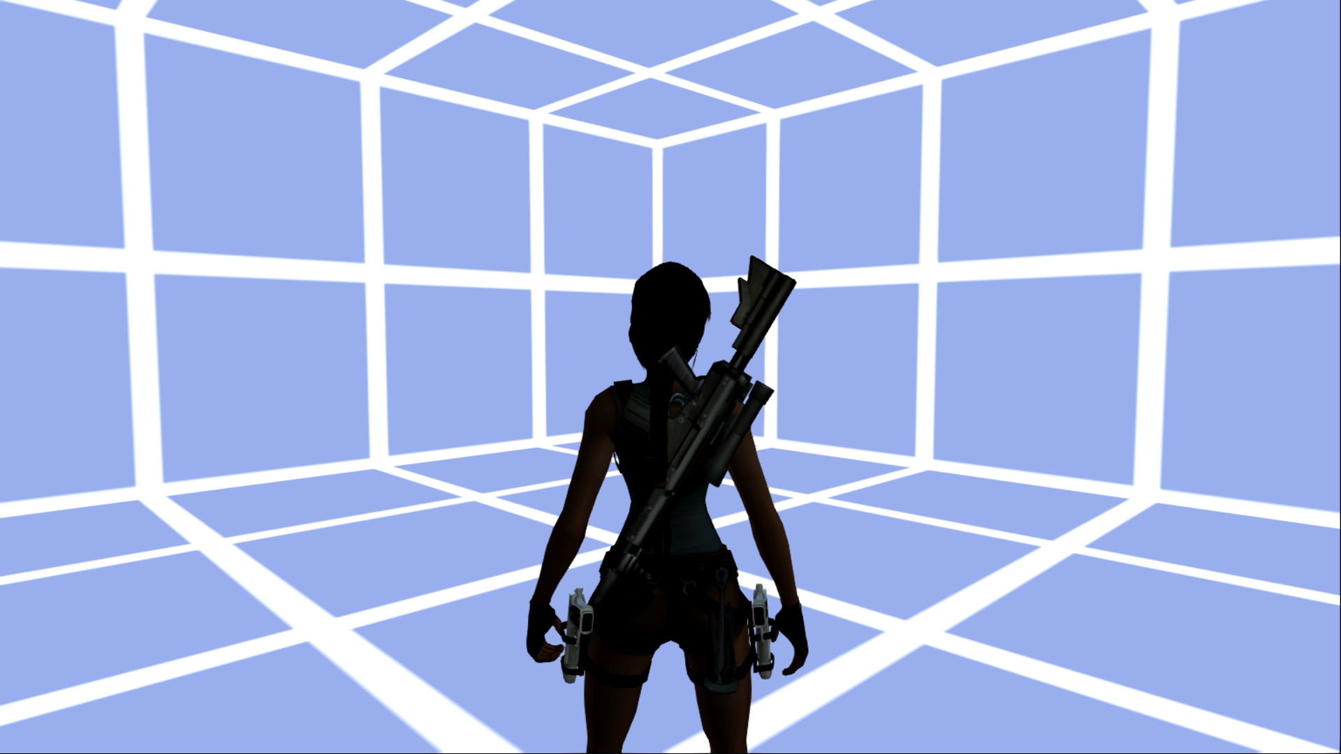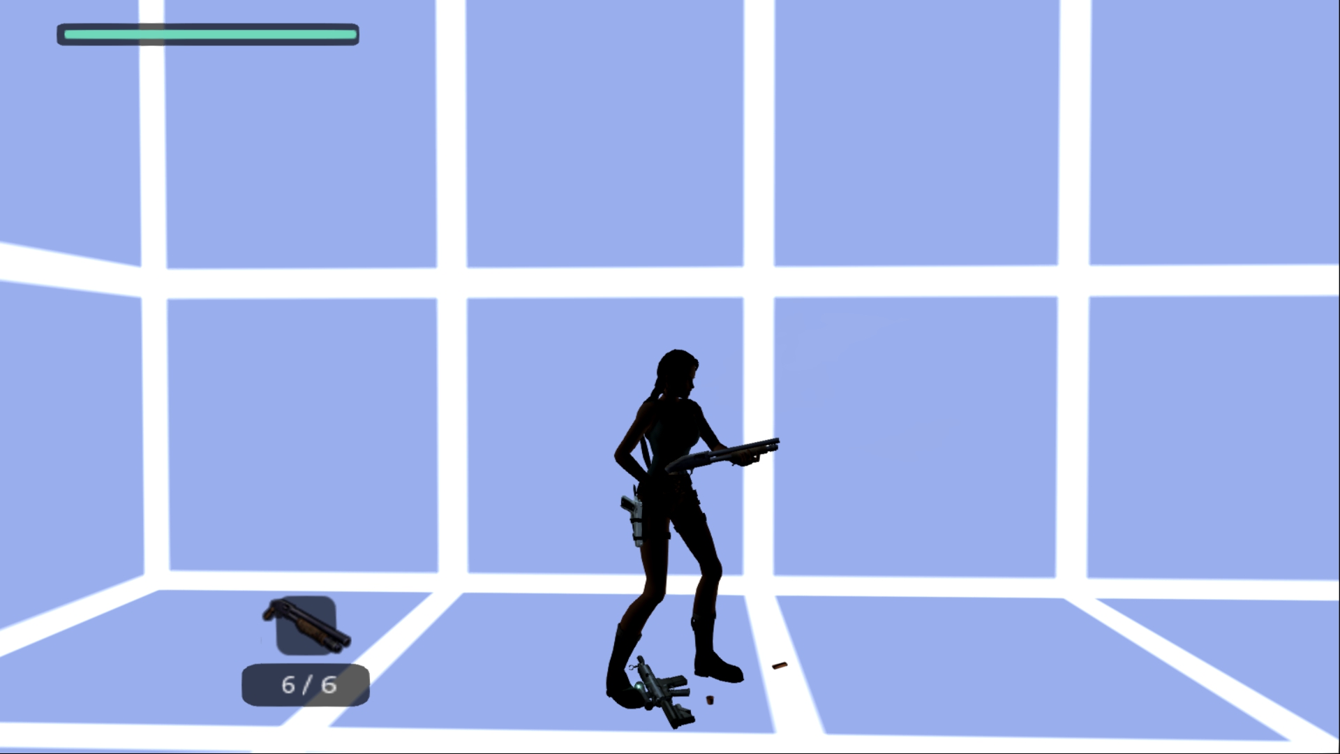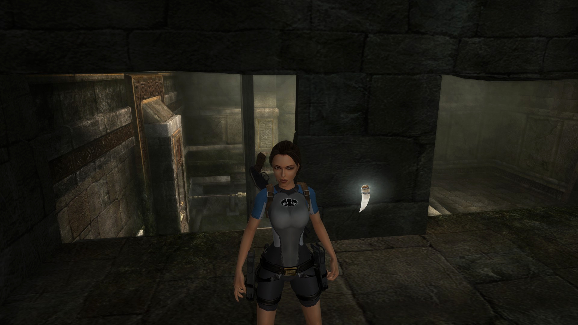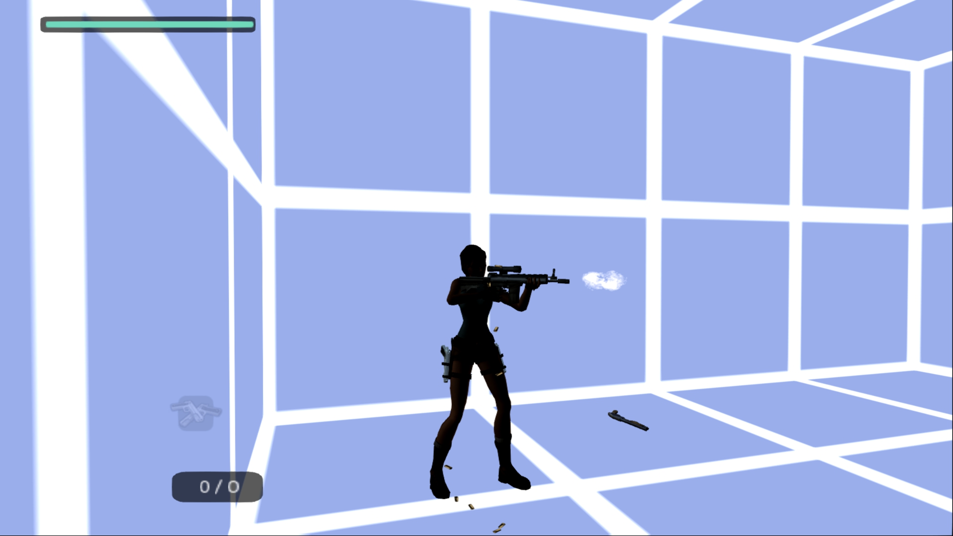 Итак, первым, куда я смог телепортироваться, оказалась тестовая комната, подобную которой можно найти в Tomb Raider: Legend. В этой комнате, на сей раз, есть кое-что интересное – вырезанное оружие. Всего на полу два оружия: дробовик и автомат. Напомню, что в числе оружий Лары только УЗИ были скорострельными.