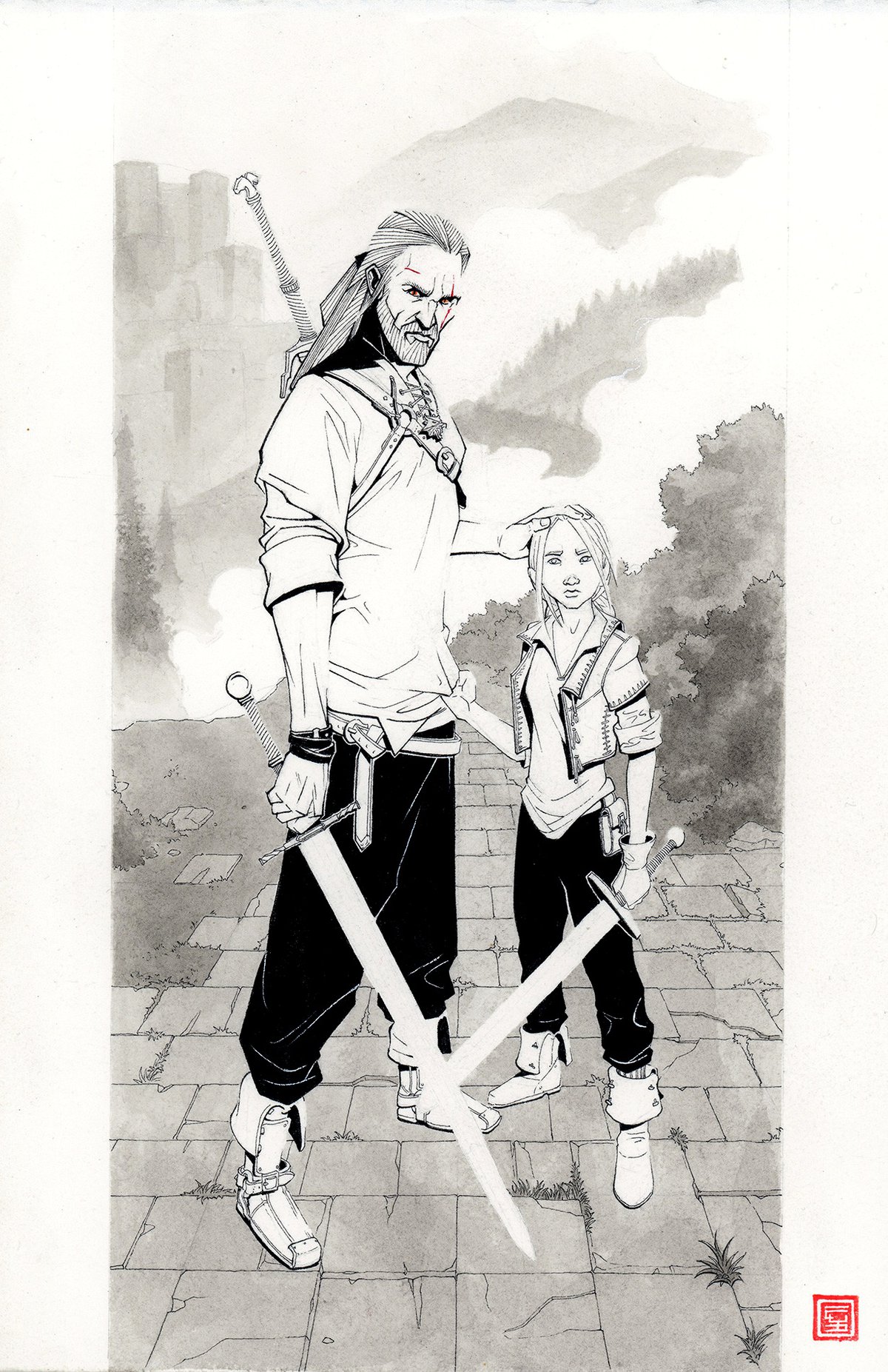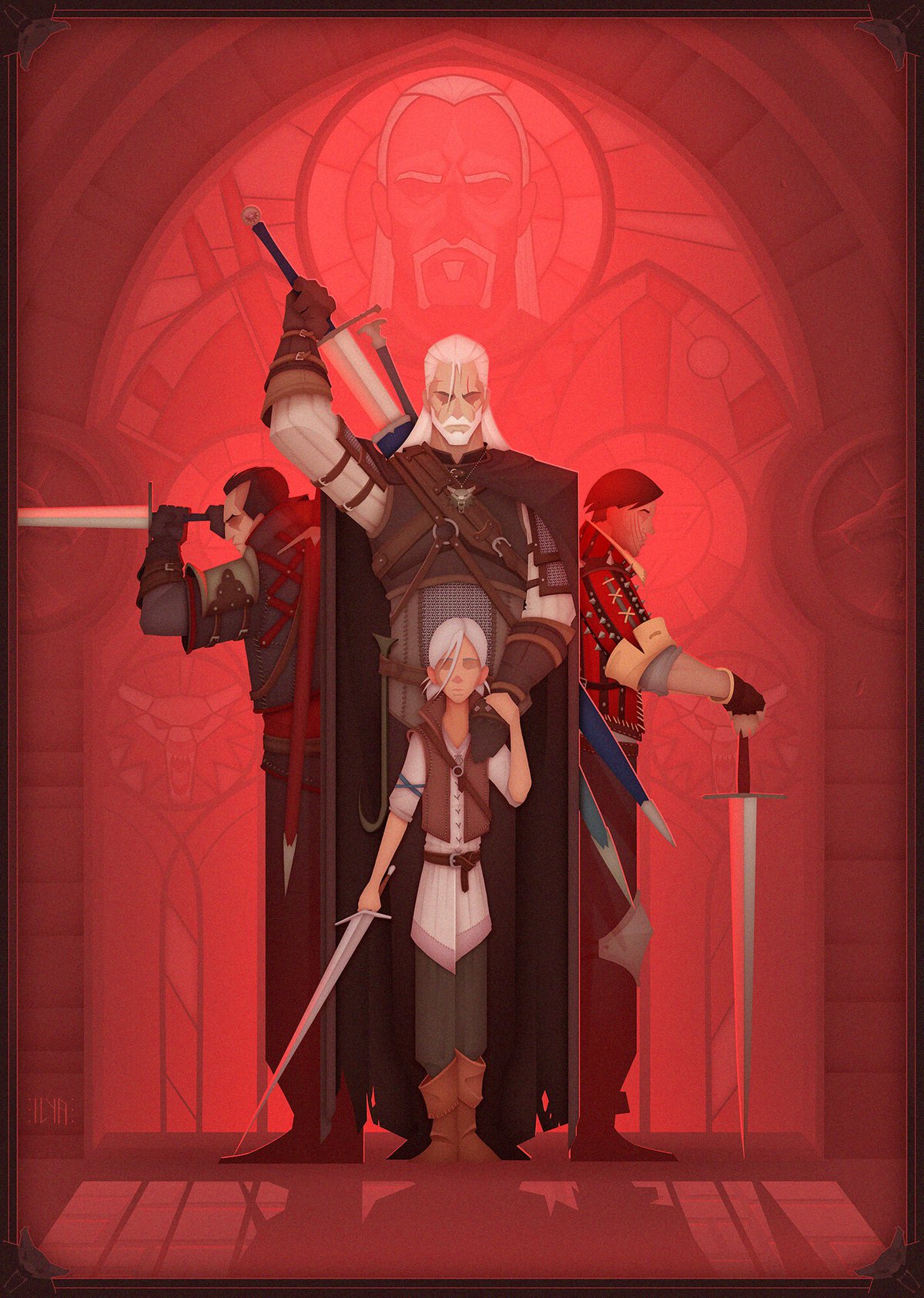 Еще один арт отсылает к ведьмачьим тренировкам, а третий — самый интересный — посвящен всему ведьмачьему семейству. К Геральту и Цири здесь присоединились Ламберт и Эскель. Кстати, Весемир тоже здесь.