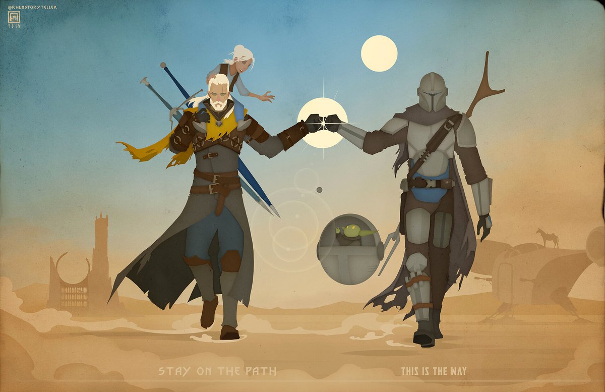 Например, одна из работ Ильи посвящена встрече двух отцов: Дина Джарина из «Мандалорца» и Геральта. Кажется, «маленький Йода» все-таки практичнее Цири — во всяком случае, он не использует «отца» в качестве транспортного средства.