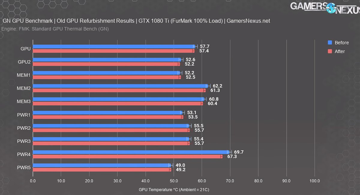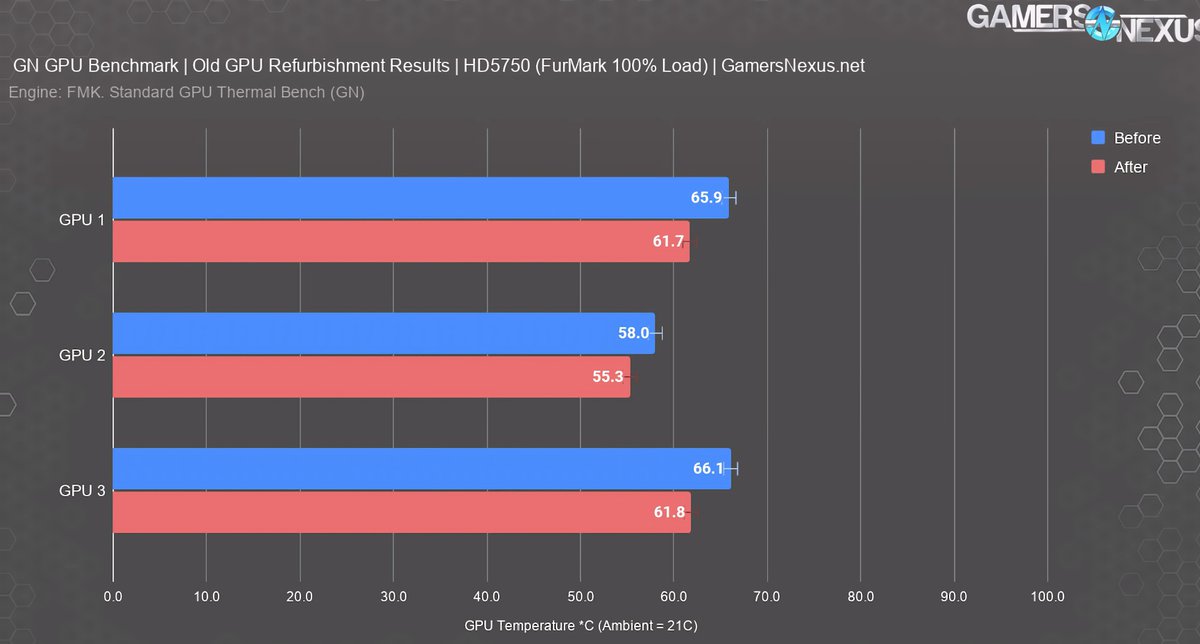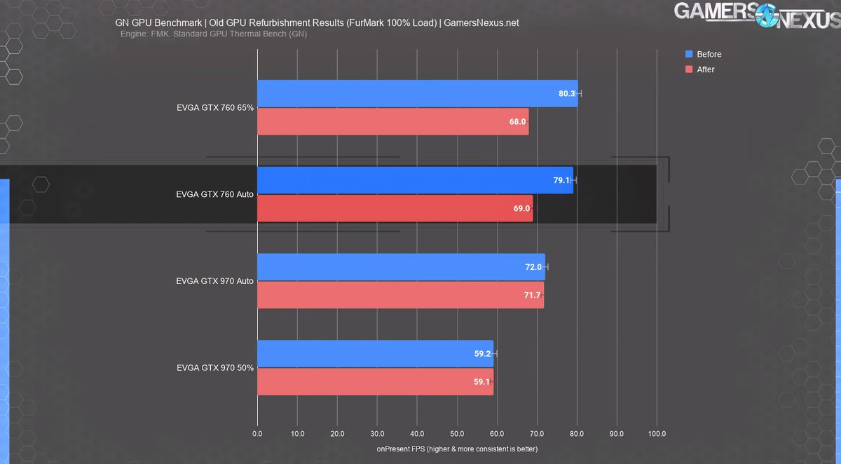 Стивен Берк с канала Gamers Nexus решил проверить, насколько велик эффект от этих мероприятий. За годы работы в мастерской у ютуберов скопилось множество видеокарт: эксперименты были проведены на Radeon HD 5750, GeForce GTX 760, GeForce GTX 970 и GeForce GTX 1080 Ti.