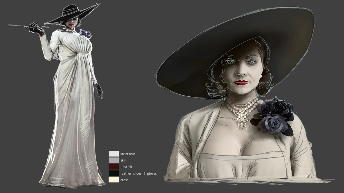 Внешность Димитреску придумали в самом начале разработки, причем изначально ее прототипировали с помощью модели Мии из Resident Evil 7. Сперва ее одели в шляпку и платье, попытавшись придать призрачный вид, но ничего не вышло.