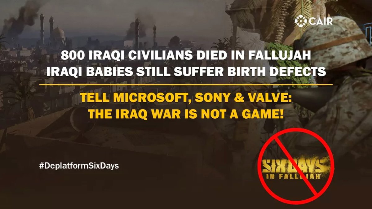 Правозащитная организация Council on American-Islamic Relations, занимающаяся юридической защитой прав мусульман, выпустила заявление о тактическом шутере Six Days in Fallujah. Организация просит Valve, Sony и Microsoft отказаться от распространения шутера на своих площадках.