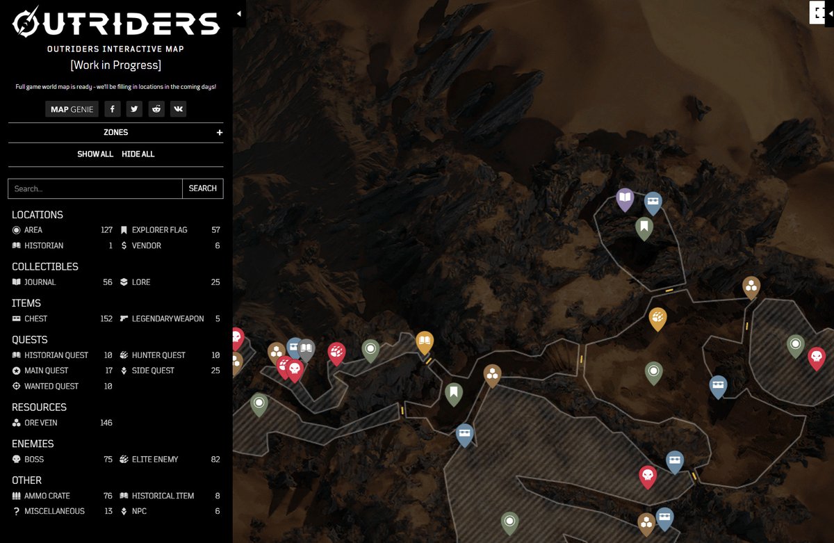 Команда Mapgenie запустила интерактивную карту ролевого экшена Outriders. Сейчас картографированы все 18 игровых зон, все они собраны на единой глобальной карте.