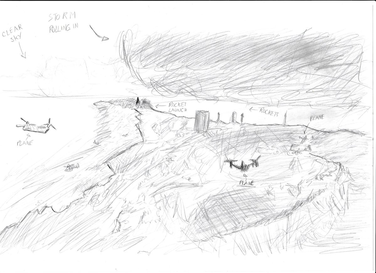 На конвертопланах, допускает инсайдер, игроки смогут полетать самостоятельно. Набросок изображает не часть сюжетной кампании, а одну из мультиплеерных карт, рассчитанных на 128 игроков — но буря, отмечает Том, это просто буря, а не намек на Королевскую битву.