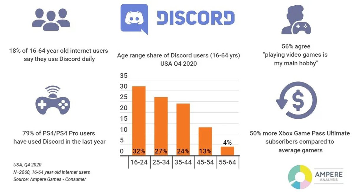 Дело именно в аудитории. По оценке Ampere, в 2020 году Discord пользовались 42% жителей США возрасте от 16 до 64 лет, в принципе выходящие в интернет. Сам сервис насыщен игроками, причем 38% аудитории Discord — невероятно активные игроки, много играющие на разных типах устройств и проводящие время как в платных, так и в бесплатных играх.