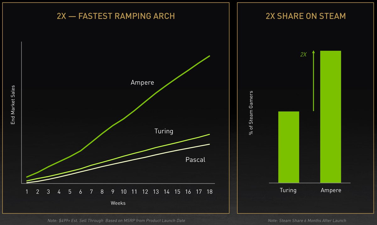 Конкретные цифры компания не называет, однако известно, что видеокарты семейства GeForce RTX 3000 набирают долю рынка гораздо быстрее, чем карты GeForce RTX 2000. Через полгода после старта продаж доля RTX 3000 в Steam оказалась вдвое выше, чем у RTX 2000 за аналогичный промежуток времени.