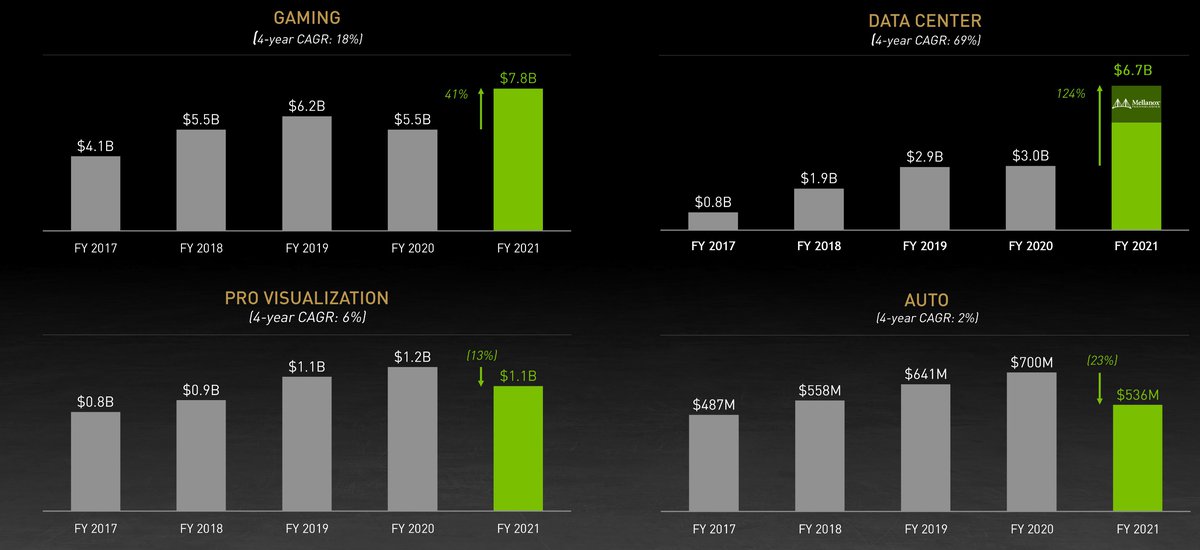 Благодаря хорошим продажам новых видеокарт выручка игрового направления Nvidia выросла на 41% по сравнению с прошлым годом. В 2021 финансовом году подразделение заработало $7.8 миллиарда — почти вдвое больше, чем за 4 года до этого.