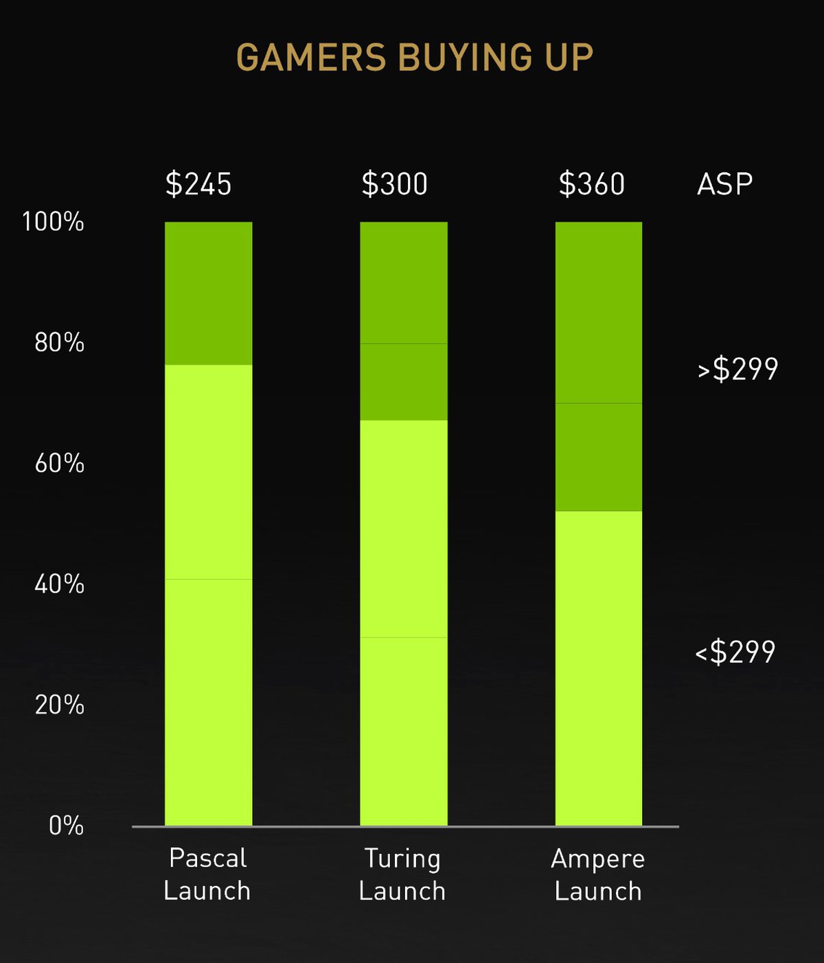 Кроме того, сейчас игроки покупают более дорогие видеокарты. В первые полгода после выпуска серии GeForce RTX 3000 примерно половина купленных видеокарт всех моделей стоила дороже $299; в случае с RTX 2000 этот показатель был в районе 30%, у карт предыдущего поколения — еще ниже.