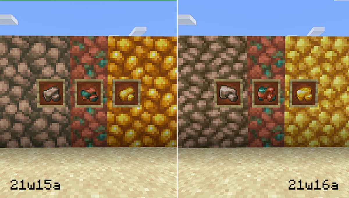 Разработчики скорректировали текстуры необработанной руды — новый и старый варианты показаны выше. Кроме того, снапшот 21W16A разрешает удобрять азалию костной мукой — после этого она превратится в дерево.