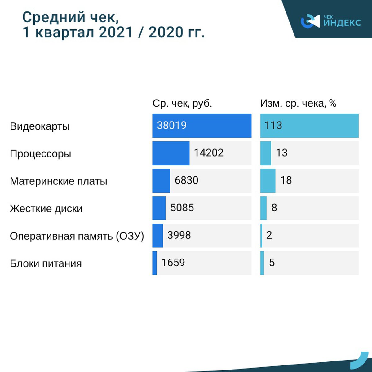 Средний чек на покупку видеокарты в первом квартале составил 38019 рублей, на 113% больше, чем годом ранее. Объем продаж видеокарт по сравнению с прошлым годом увеличился на 74%.