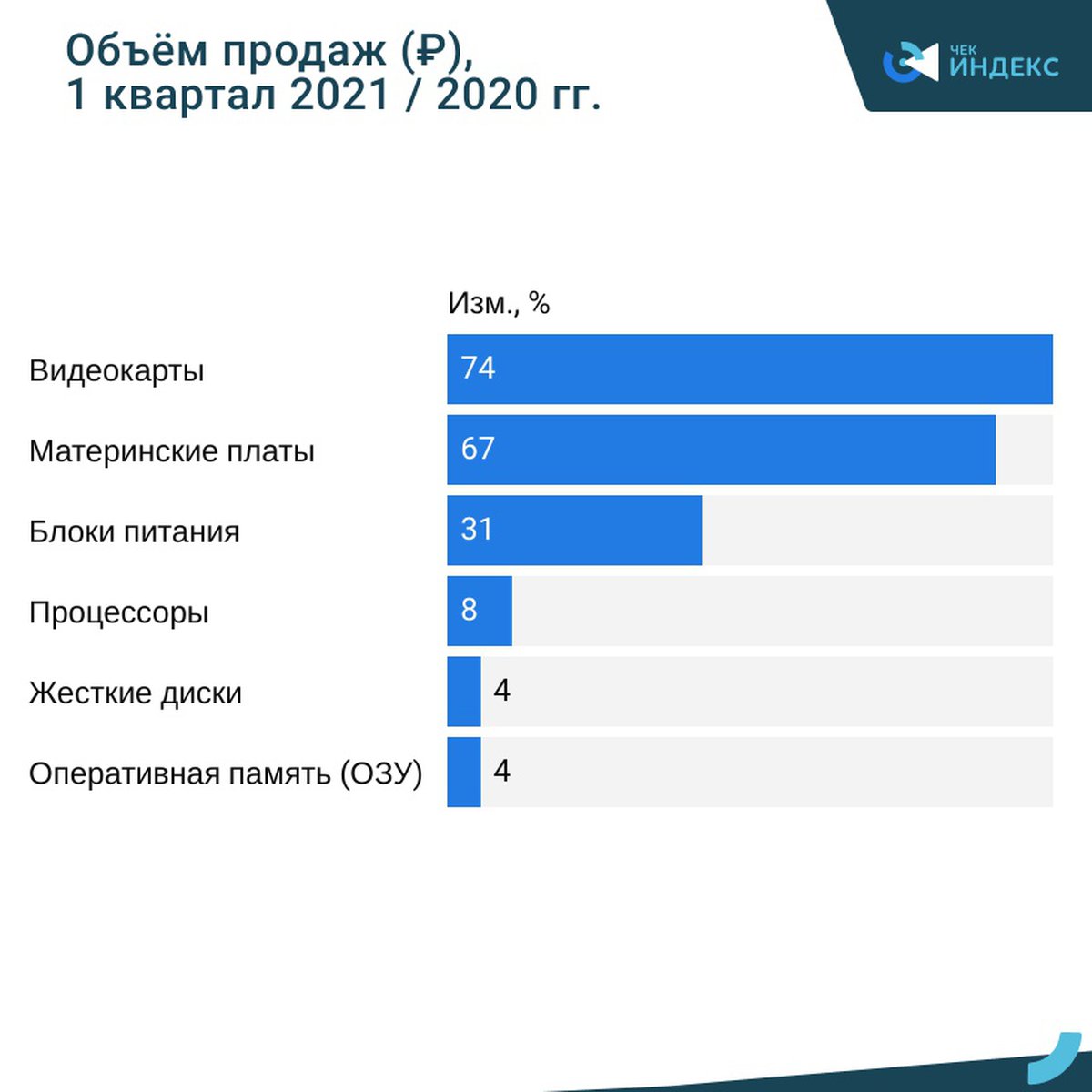 Интересно, что рост объема продаж зафиксирован не по всем видам комплектующих. У видеокарт и материнских плат он выше всего, но у процессоров рост составил лишь 8% к прошлому году, а у жестких дисков и памяти — только по 4%.
