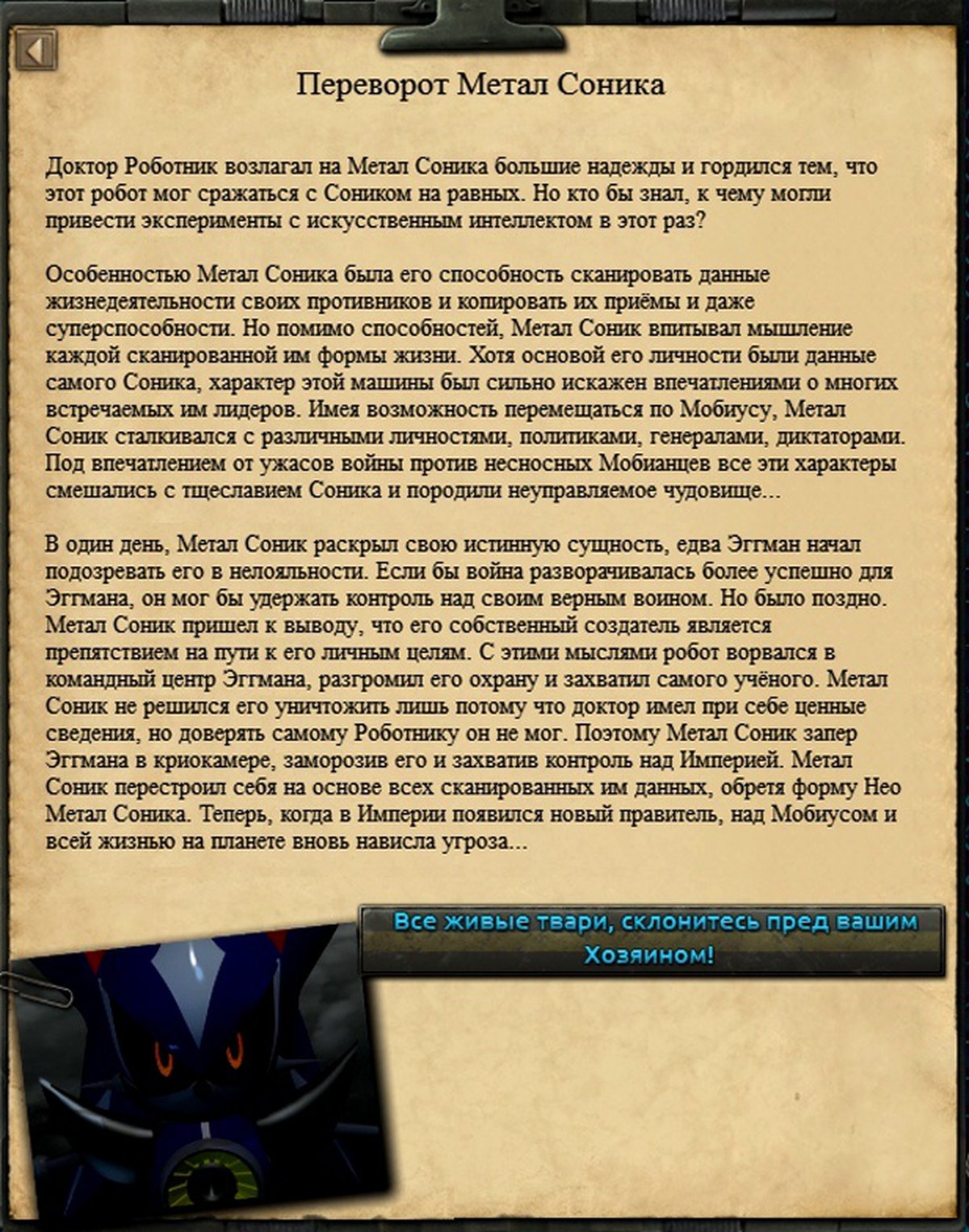 Хотя принцип превращения органиков в роботов был открыт не им самим. Технология задумывалась как средство для продления жизни, и свободная воля должна была при этом сохраняться, но Эггман внёс свои коррективы. Вот только в Хойку злобный учёный играл плохо, а поэтому накосячил со снабжением, в тылу образовалось множество партизан, и наступление захлебнулось.