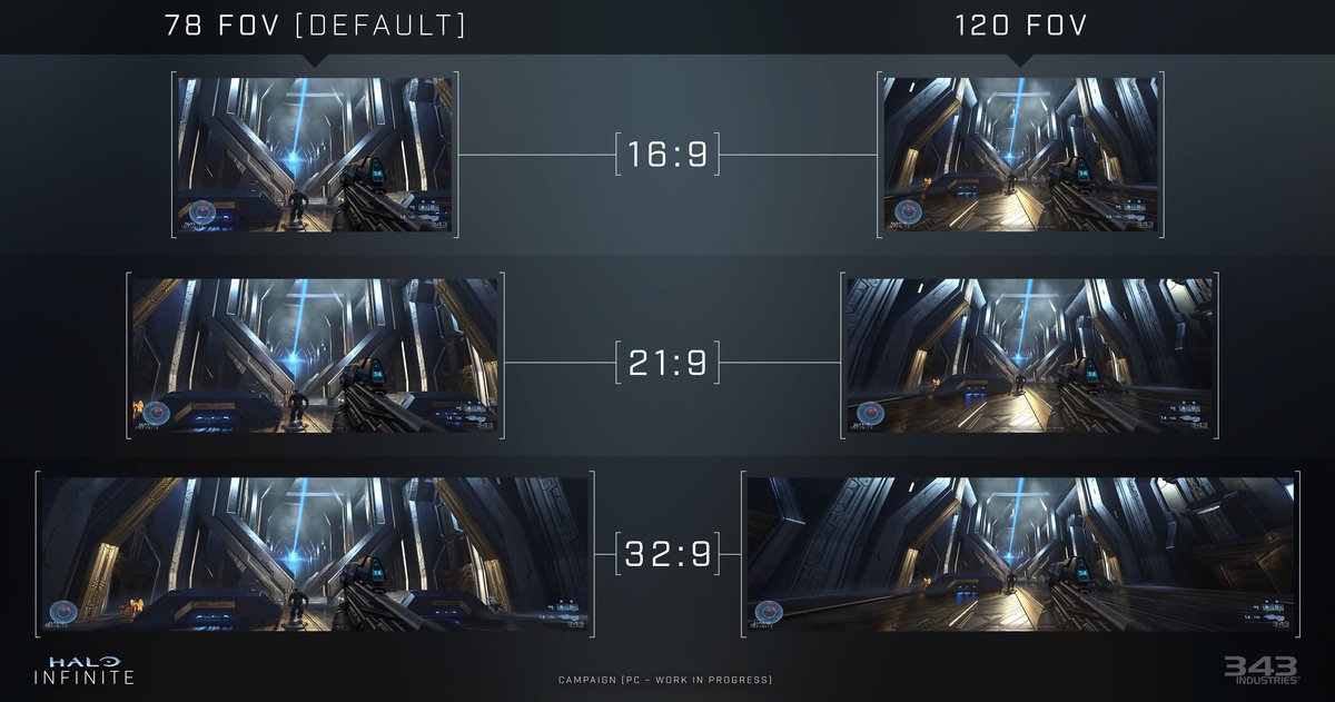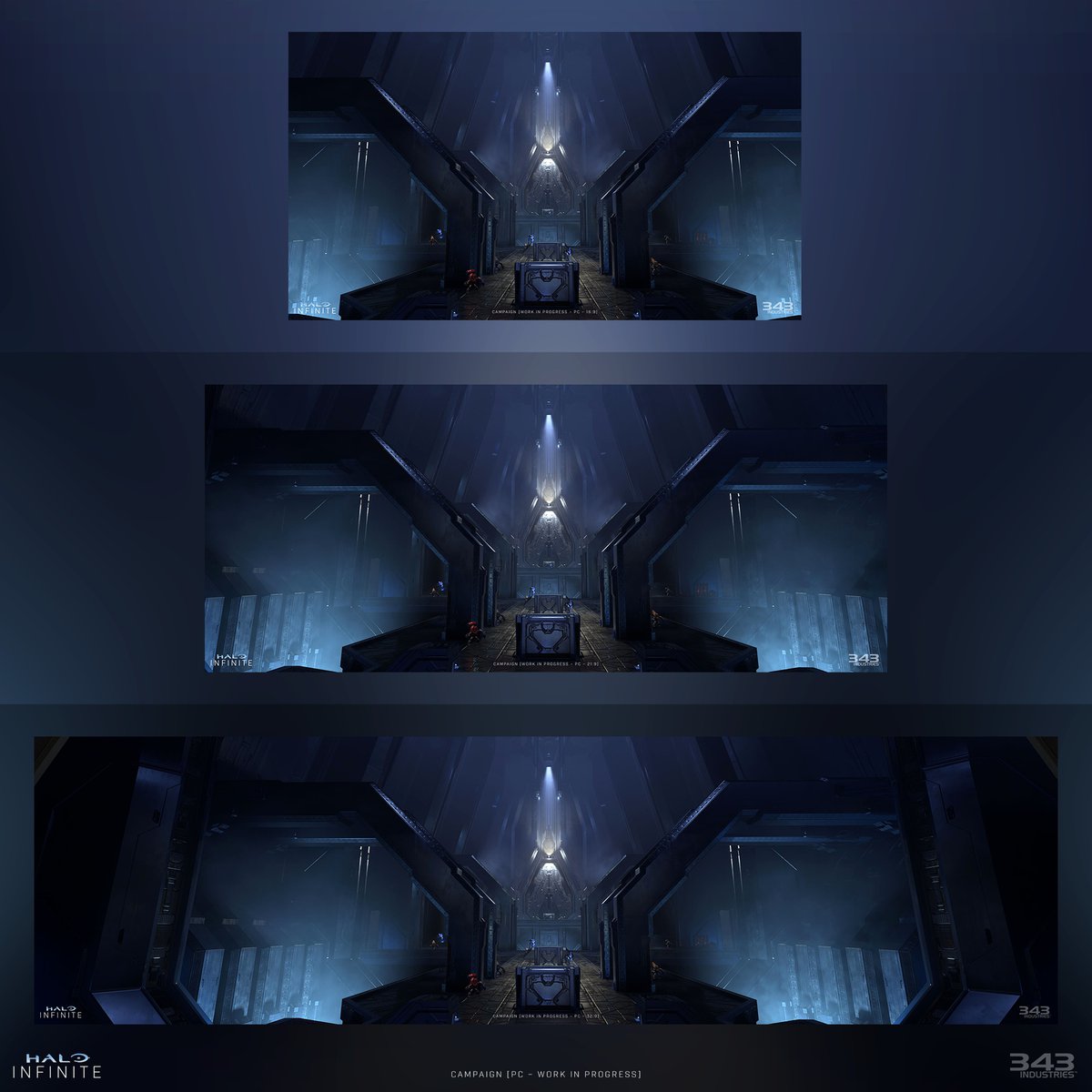 Самое широкое из показанных соотношений это 32 к 9. На самом деле, рассказывает руководитель разработки Halo Infinite Майк Ромеро, игра может поддерживать и более широкие экраны: она подстраивается под них автоматически.