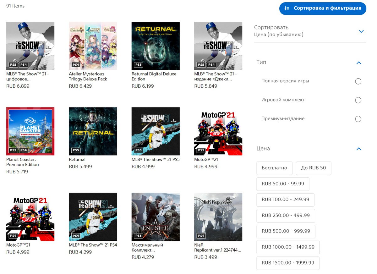 Фильтры были в старой версии PlayStation Store, после запуска нового магазина с поддержкой PlayStation 5 они исчезли. Сейчас магазин предлагает шесть фильтров: по типу, цене, жанру, платформе, дате выпуска и поддержке VR.