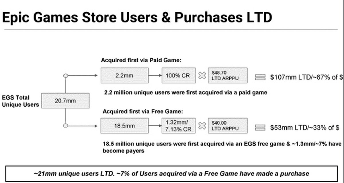 Игроки, привлеченные в Epic Games Store бесплатными играми, иногда что-то покупают. Из 18.5 миллионов игроков, привлеченных благодаря бесплатным раздачам, 1.32 миллиона (около 7%) позднее оформили покупку; это принесло магазину $53 миллиона. Для сравнения: 2.2 миллиона игроков, изначально зарегистрировавшихся ради покупки, принесли $107 миллионов.