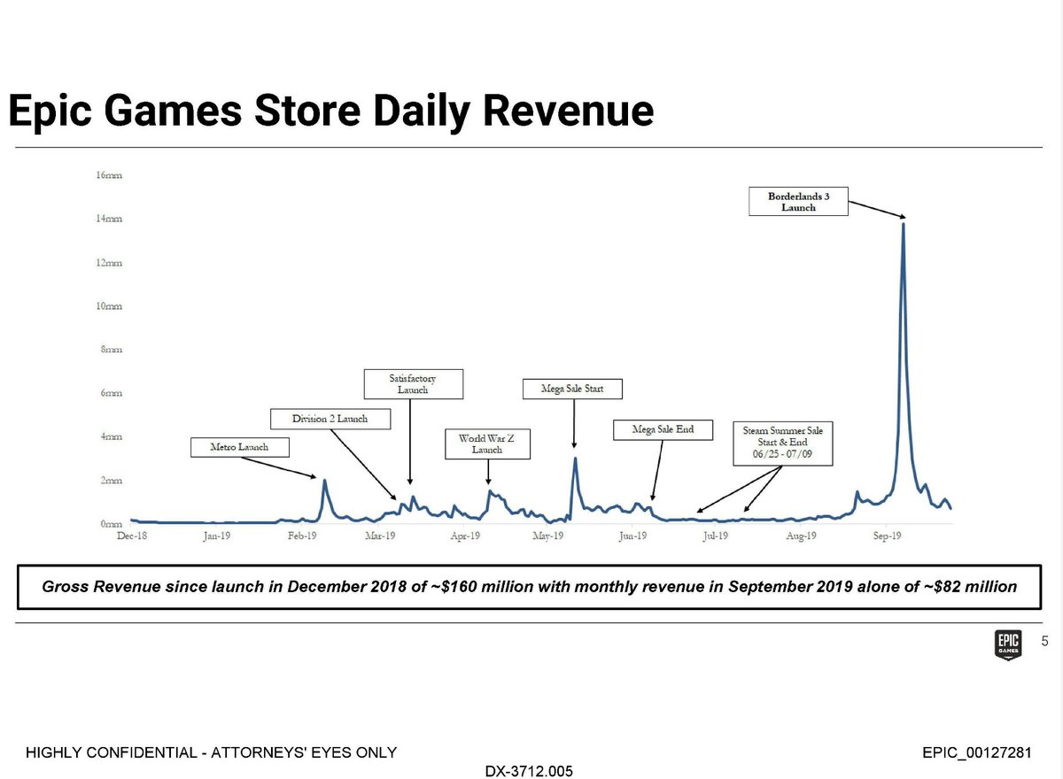 Например, теперь мы знаем, что в первый год магазин заработал около $160 миллионов. Самым успешным месяцем стал сентябрь 2019 года, когда вышла Borderlands 3: выручка составила $82 миллиона.