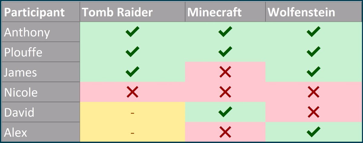 Еще один человек оказался прав в двух случаях из трех, один ошибся во всех трех случаях. Два испытуемых правильно определили по одной игре, ошиблись по второй и не смогли сделать однозначный вывод в третьем проекте. В обоих случаях это был Shadow of the Tomb Raider.