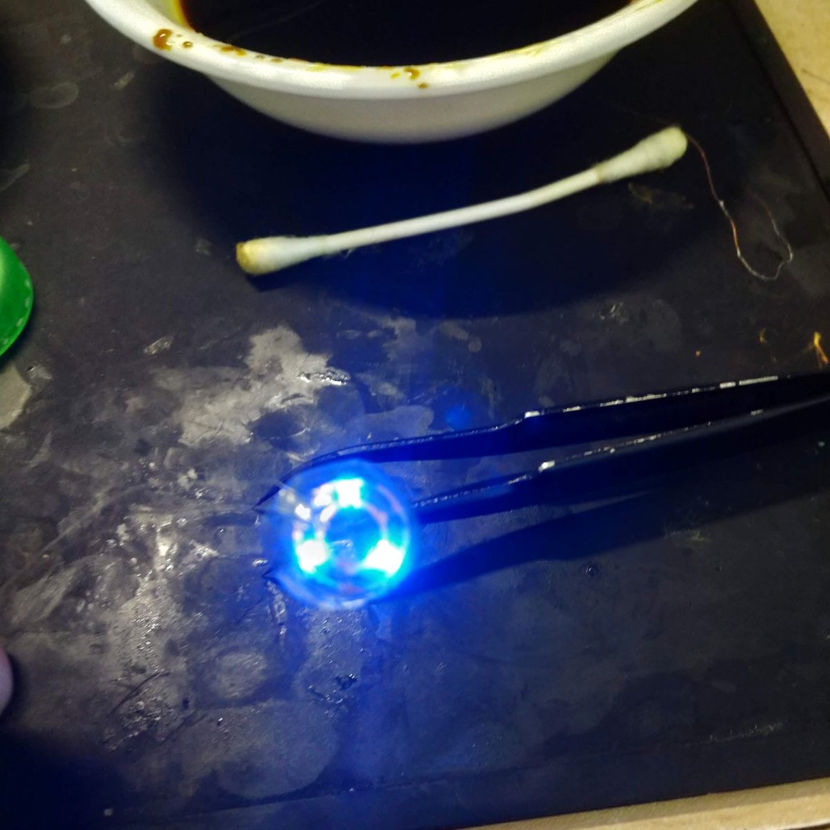 В качестве материала была выбрана медь. Плата была довольно простой: круглая подложка с несколькими местами для крепления светодиодов и подключения питания. Оставалось только аккуратно все припаять.
