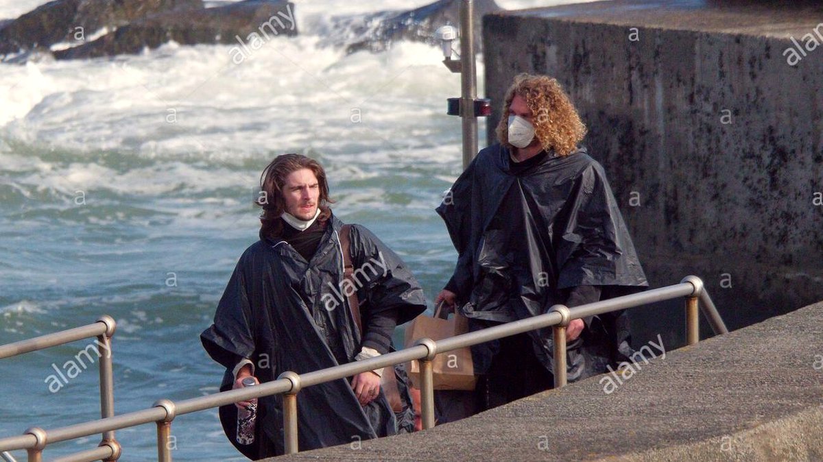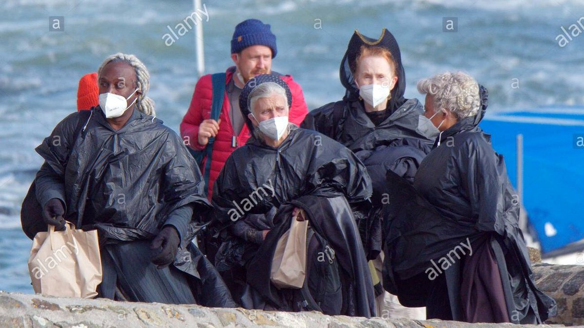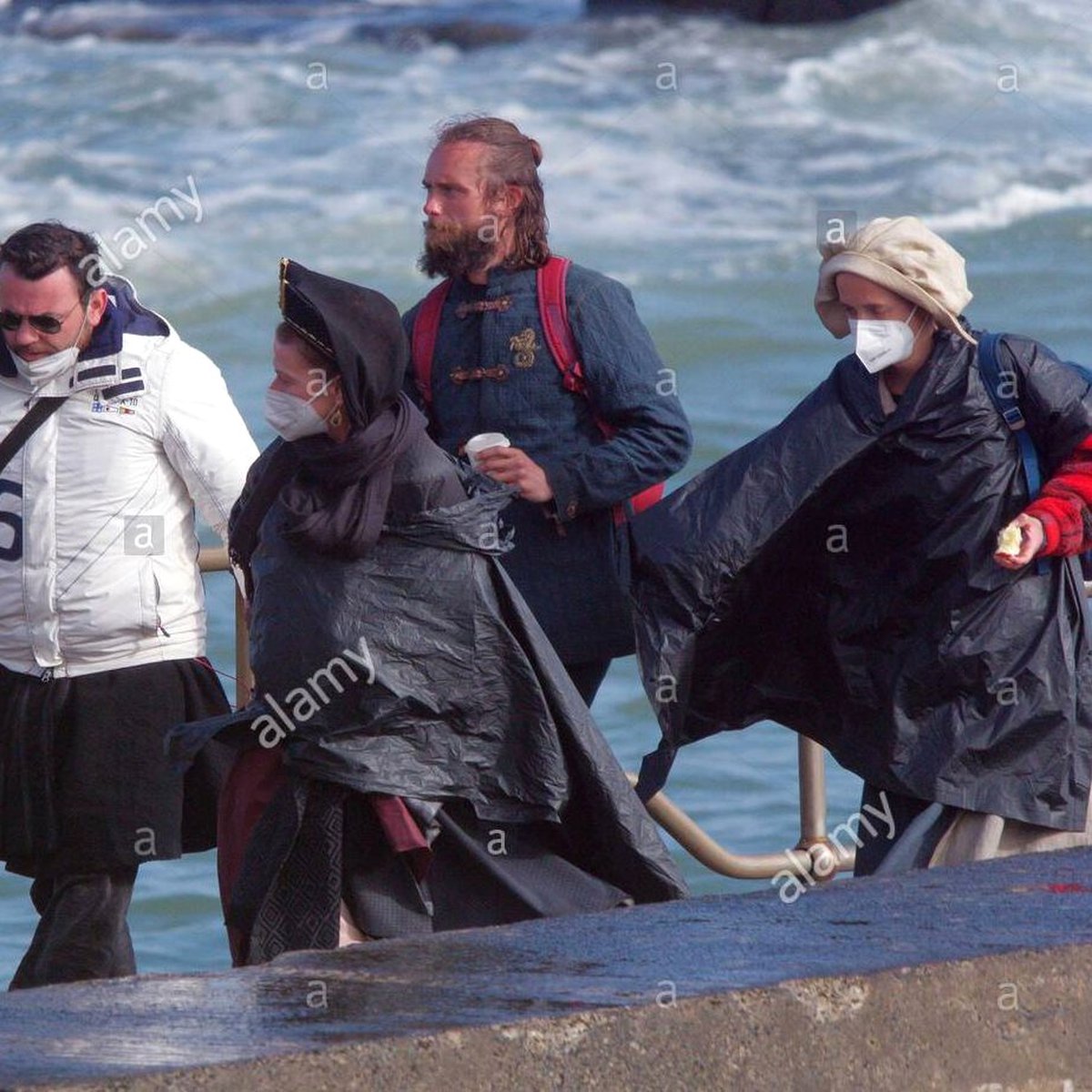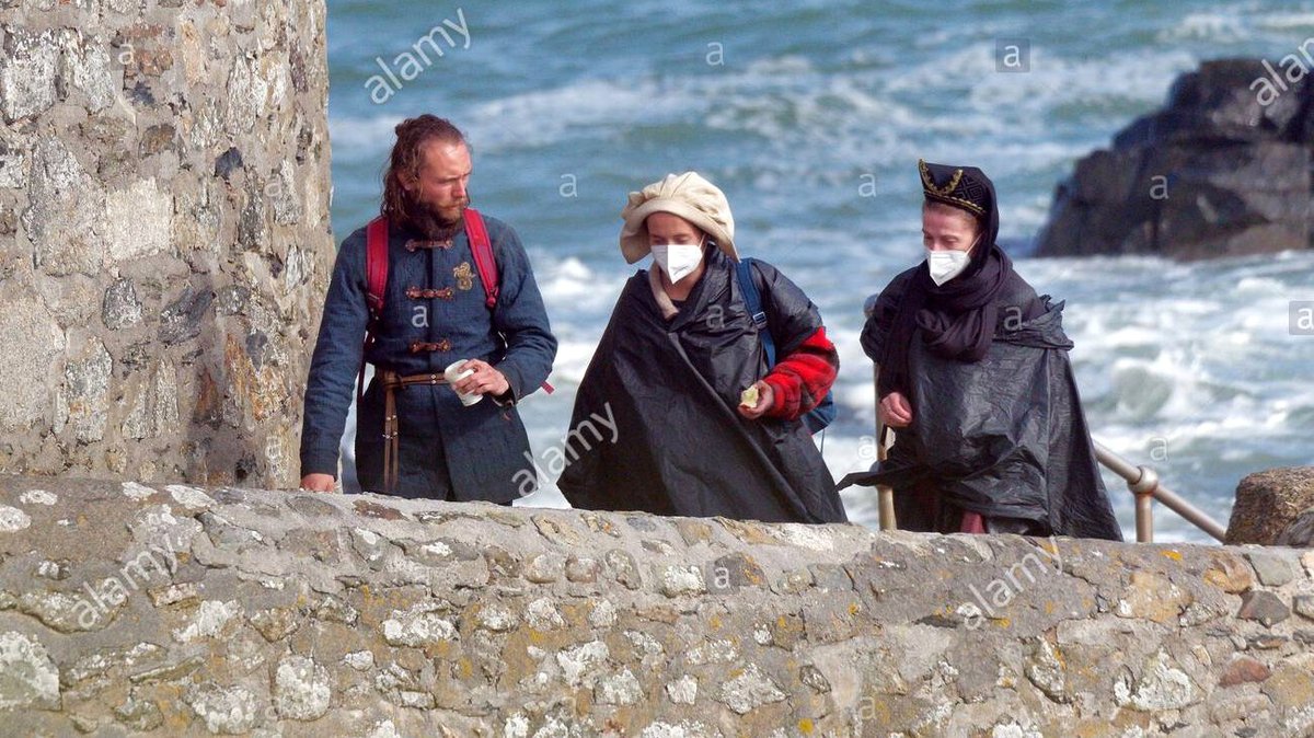 Персонажей с остальных снимков пока не опознали. Накидки, прикрывающие костюмы, актеры носят для защиты и от брызг, и от холода: съемки ведутся на побережье острова Сент-Майклс-Маунт.