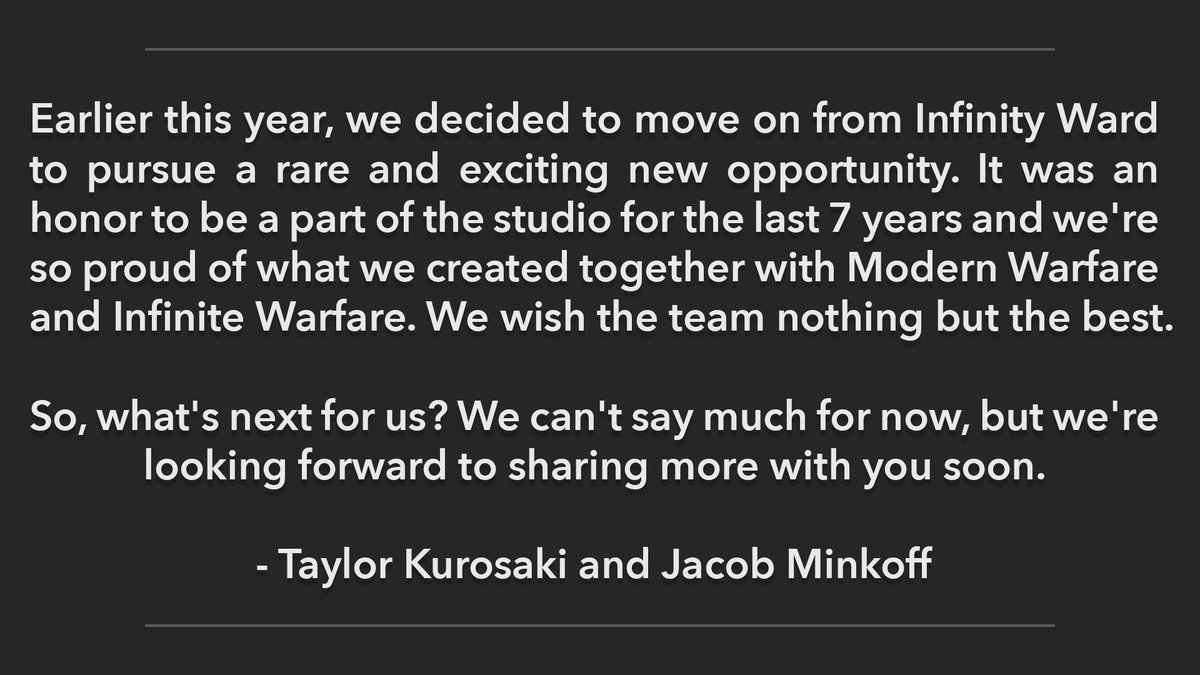 Из студии Infinity Ward уволились Тейлор Куросаки и Джейкоб Минкофф, ведущие разработчики Call of Duty Modern Warfare и Call of Duty Infinite Warfare.