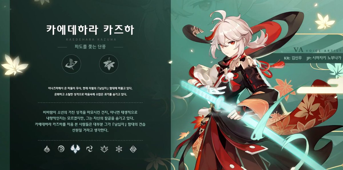 Появится новый персонаж, Каэдехара Казуха. Это герой с пятью звездами редкости, пришелец из Инадзумы. Казуха — самурай, специализирующийся на ближнем бою и сражающийся при помощи меча. В арсенале персонажа есть несколько атак, способных наносить урон по области или притягивать врагов.
