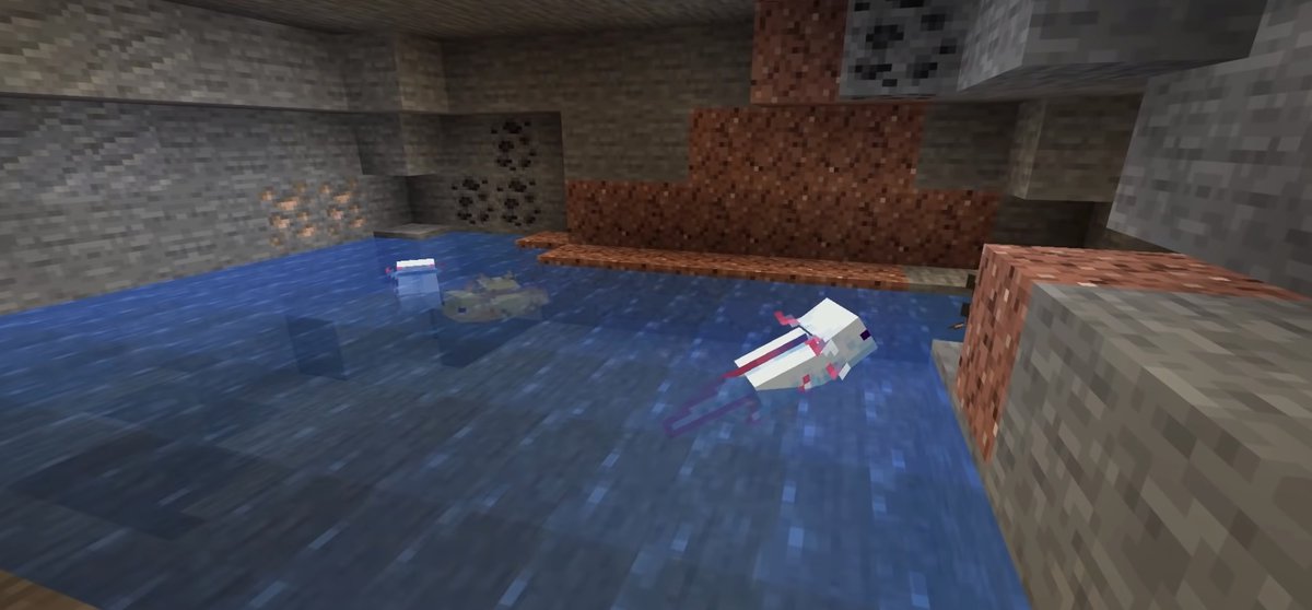 Аксолотли должны спавниться в пышных пещерах, новом биоме Caves and Cliffs. Но пока этого биома нет, игроки смогут находить новых мобов в обычных озерах, расположенных ниже уровня земли.