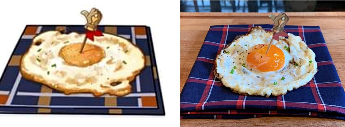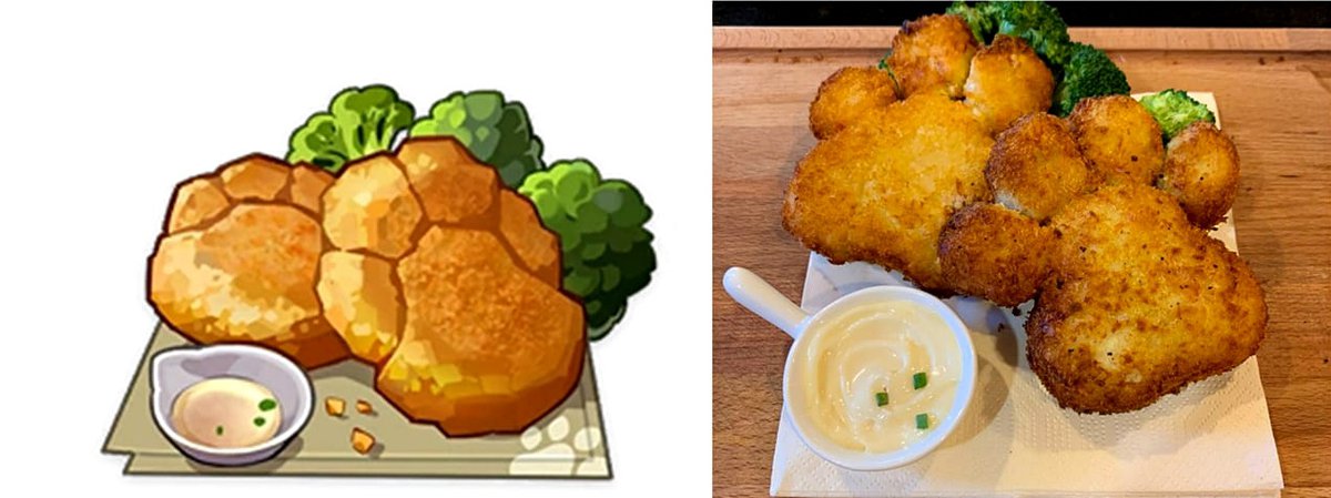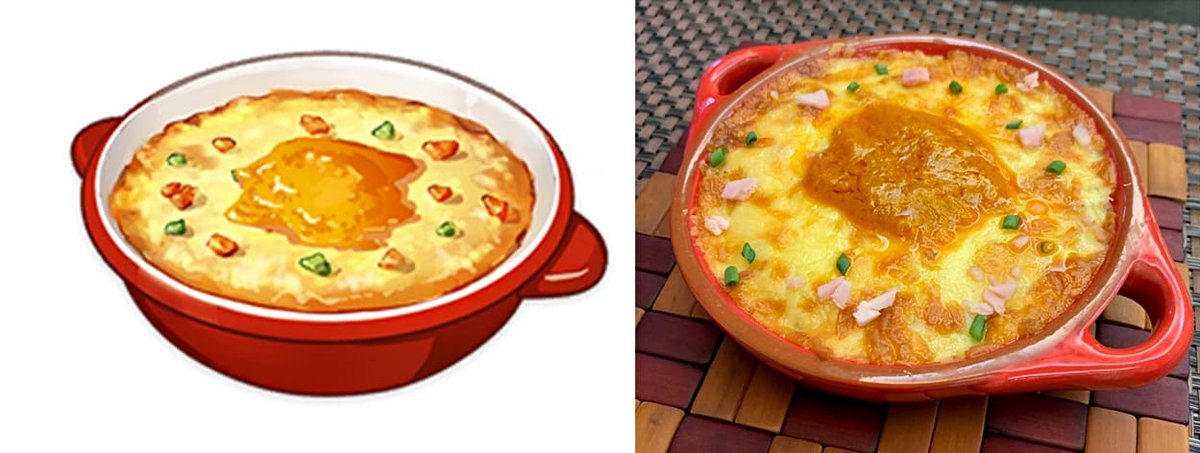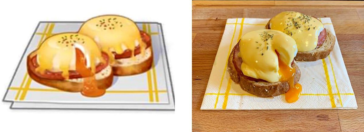 В качестве референсов обычно используются рецепты реальных блюд: их корректируют так, чтобы результат походил на изображения из Genshin Impact. Например, в основе «Яичной крепости» лежит рецепт от Гордона Рамзи.