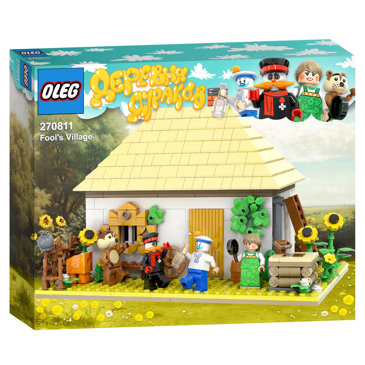 У нас есть хата главных героев, колодец, подсолнухи, печка — все из блоков LEGO. Баба, Морячок, Медведь и усатый Мужик. С пчелой и самогоном у Артема возникли сложности: у LEGO нет прозрачного матового материала и элементов, из которых можно собрать нормальную пчелу.