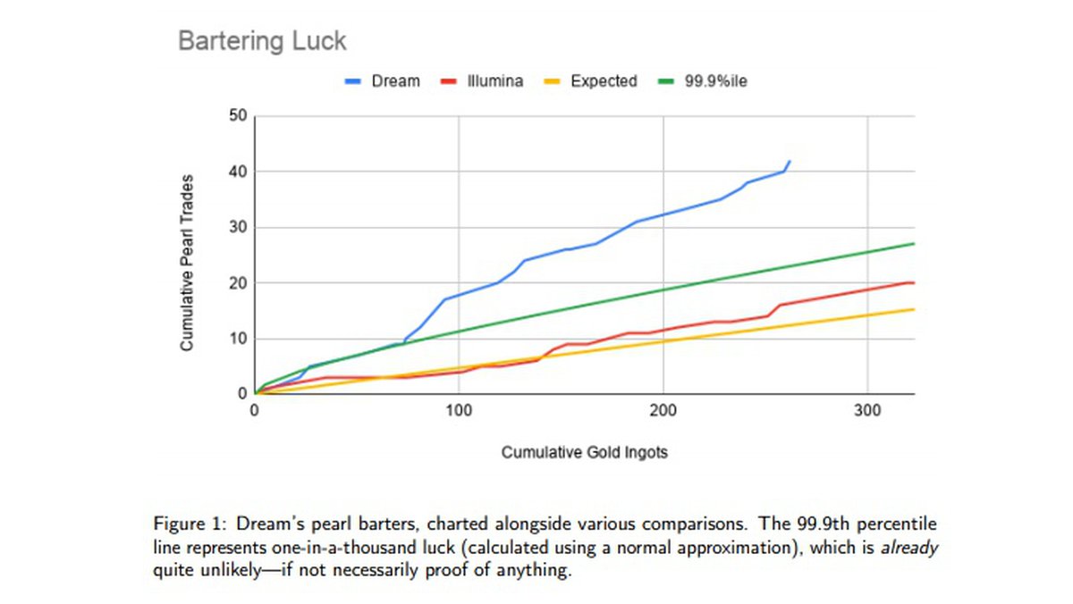 Авторы отчета пришли к выводу, что Dream играл в Minecraft с некими модификациями, влияющими на вероятность выпадения Жемчуга Края и Огненного стержня. Сам спидраннер отверг обвинения и согласился предоставить свой дистрибутив игры для анализа.