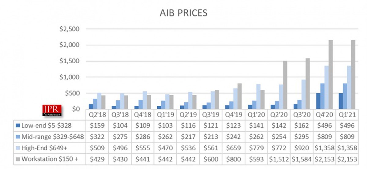Аналитическая компания Jon Peddie Research выпустила отчет, посвященный рынку видеокарт. Согласно подсчетам аналитиков, за последний год стоимость видеокарт увеличилась примерно на 370%.