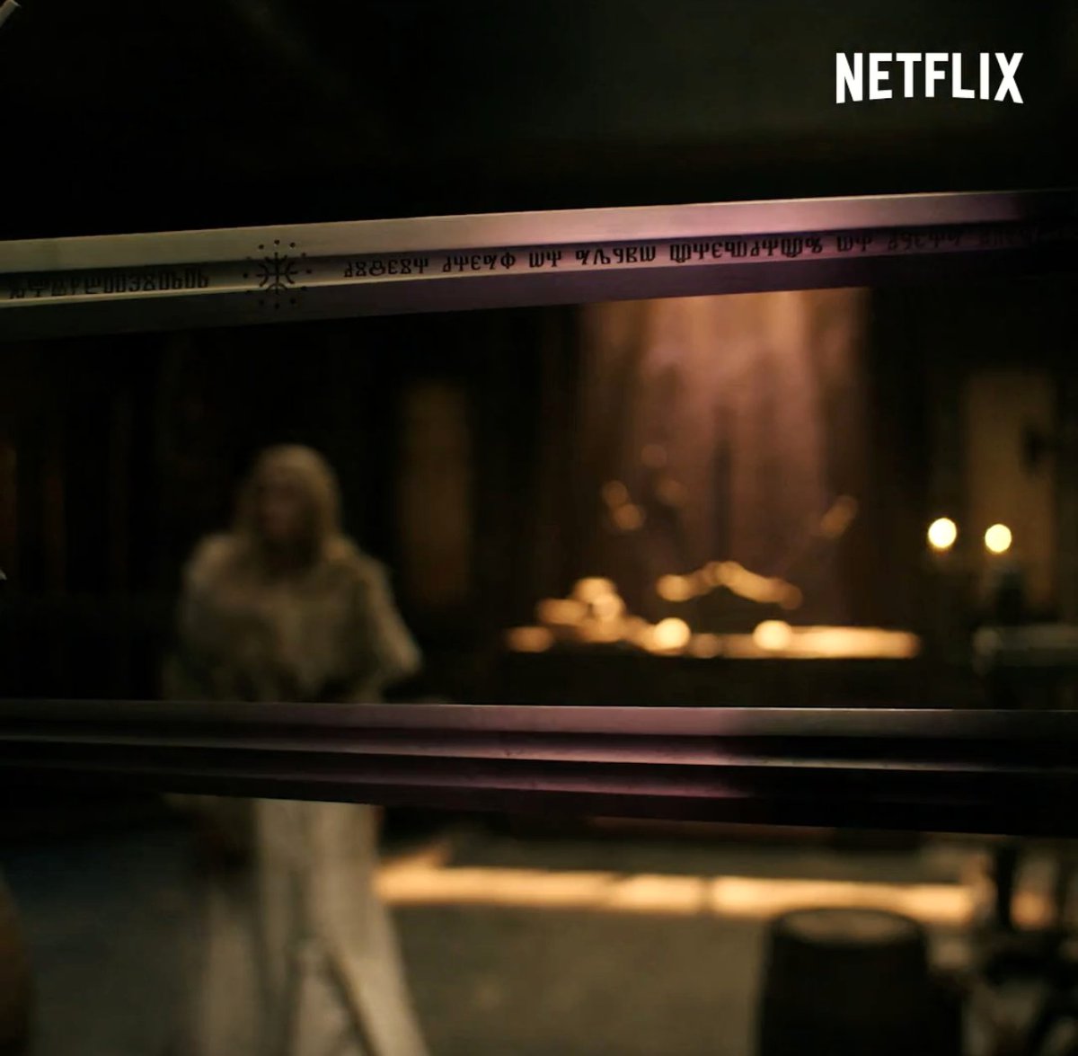 Меч на переднем плане украшен рунической надписью на старшей речи. Это не клинок Геральта из первого сезона; возможно, меч принадлежит кому-то из других ведьмаков, живущих в Каэр Морхене.