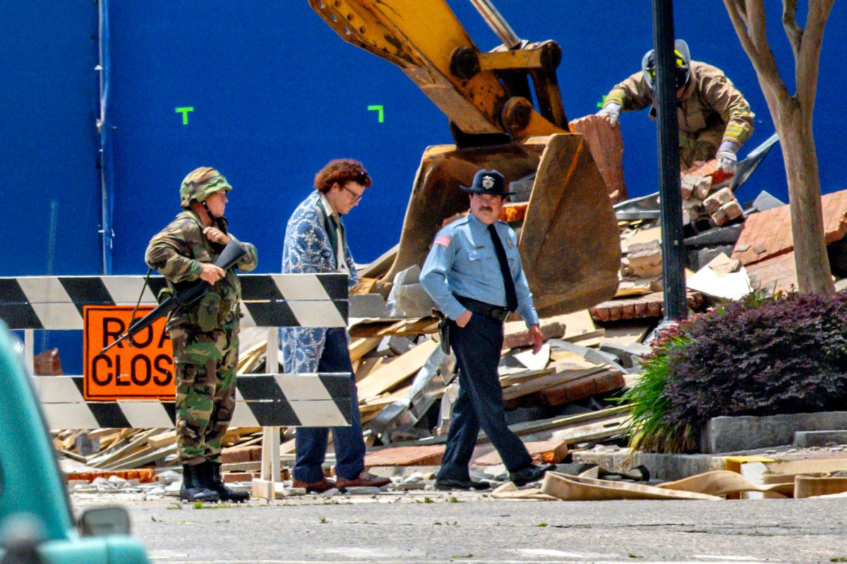 Сами руины окружены вооруженными людьми. Завалы исследую специалисты; похоже, они одеты не в защитные костюмы, а в обычное снаряжение пожарных.