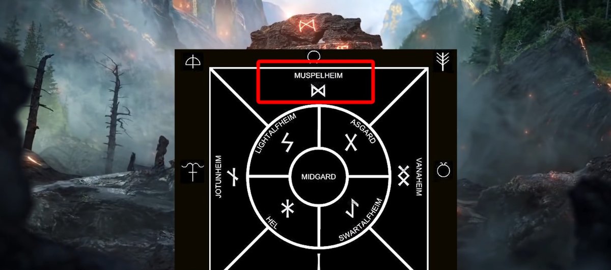 Интересный момент: для самых ненаблюдательных фанатов разработчики поместили в верхнюю часть ворот руну, явно указывающую на Муспельхейм. Руна реальная, поэтому сходство с символом из God of War это нормально.