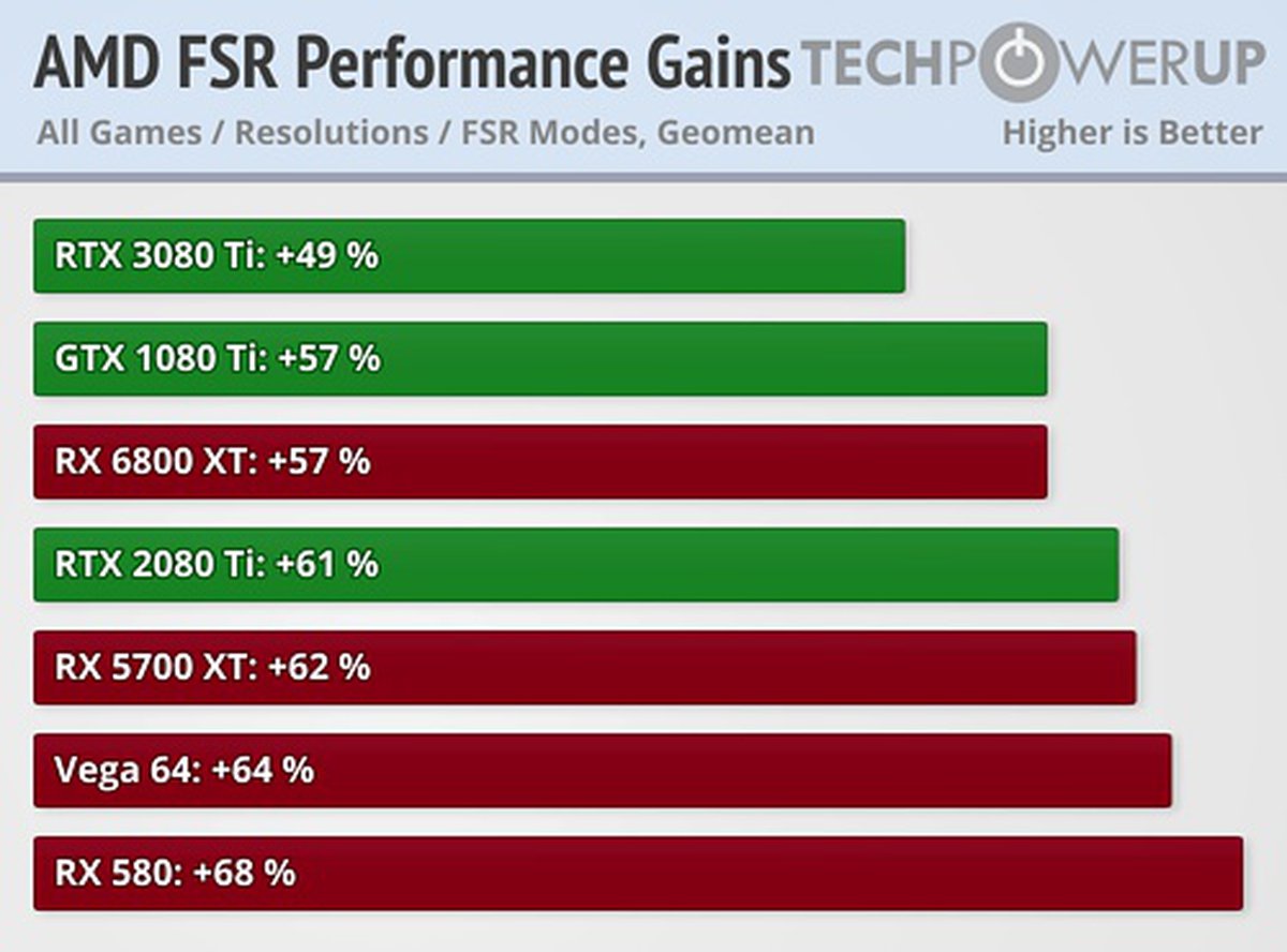 На видеокартах Radeon включение FSR в среднем дает чуть больший прирост частоты кадров, чем на картах Nvidia. Иногда технология может подглючивать: к примеру, в Anno 1800 у GeForce RTX 3080 Ti самая высокая частота кадров будет в максимально качественном режиме.