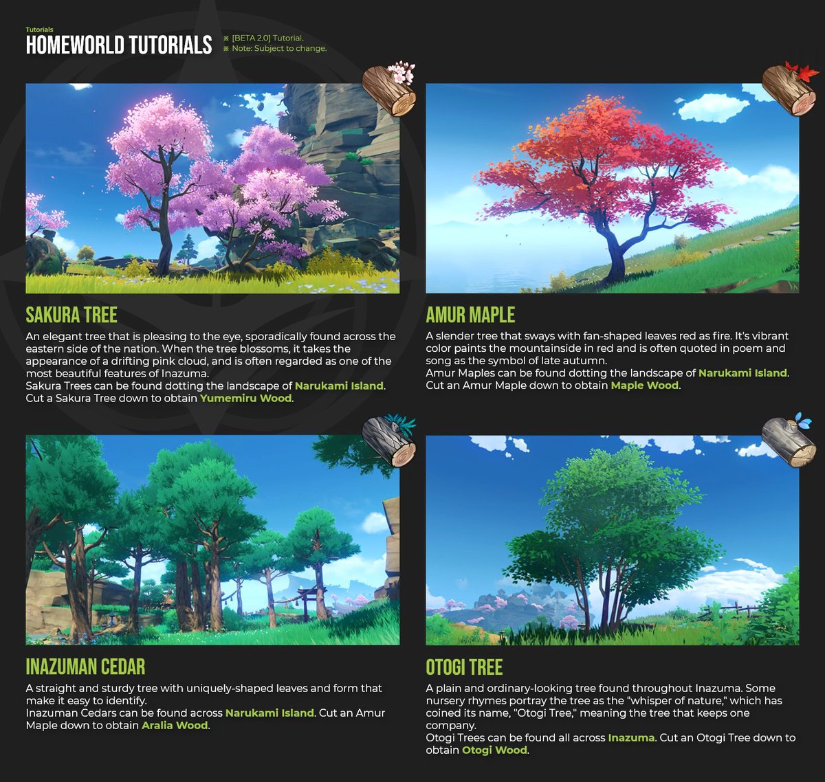 Древесина и деревья, из которых добываются новые ресурсы, названы и отрисованы в японском стиле. Они связаны с архипелагом Инадзума, новой локацией из следующего обновления, также вдохновленной Японией.