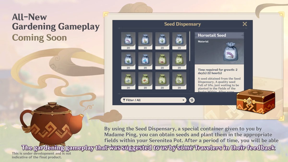 В Чайнике безмятежности можно будет заниматься сельским хозяйством. Работает просто: добываете семена, сажаете их, ждете некоторое время (до 2 дней 22 часов) и приходите собирать урожай. Растений будет очень много.