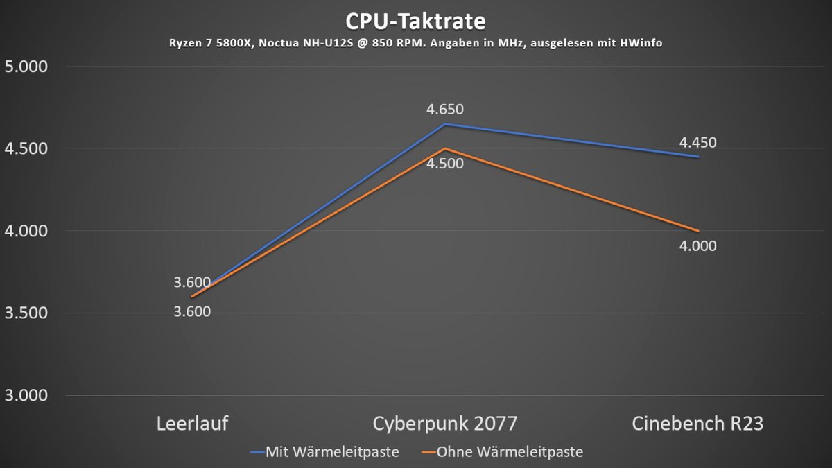 Сильнее всего частота была снижена в Cinebench R23: здесь процессор без термопасты работал на частоте 4 ГГц, а с термопастой частота повышалась до 4.45 ГГц. В то же время в Cyberpunk 2077 разница составила всего 150 МГц.