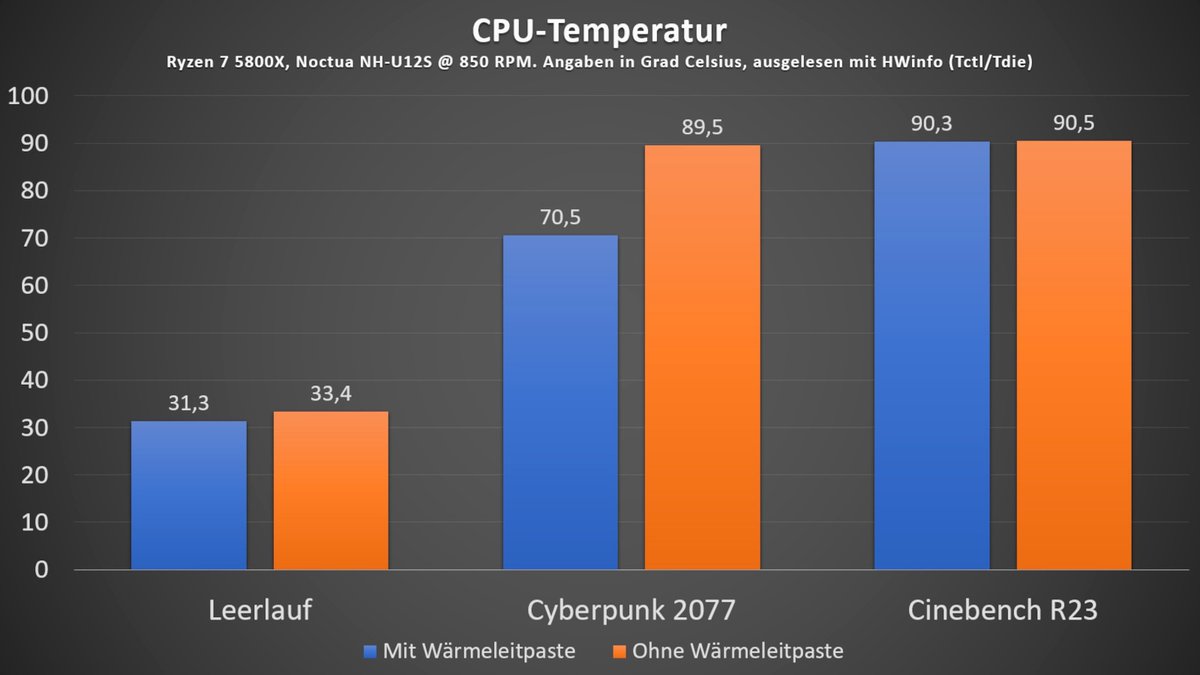 Если бы скорость вращения вентилятора не была ограничена искусственно, разница между CPU с термопастой и без нее была бы еще меньше.