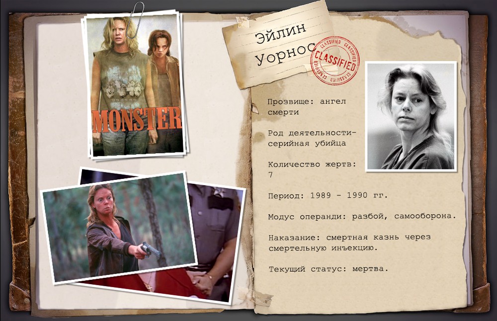 Если вы захотите узнать об Эйлин Уорнос больше, то в Википедии есть такая себе статья и есть неплохой документальный фильм «Эйлин: Жизнь и смерть серийного убийцы». Оттуда можно узнать о её крайне тяжёлом детстве (действительно не пожелаешь и врагу), попытках встать на путь праведный и жестоком мире, который снова и снова бил Эйлин по лицу, отправляя на самое дно.