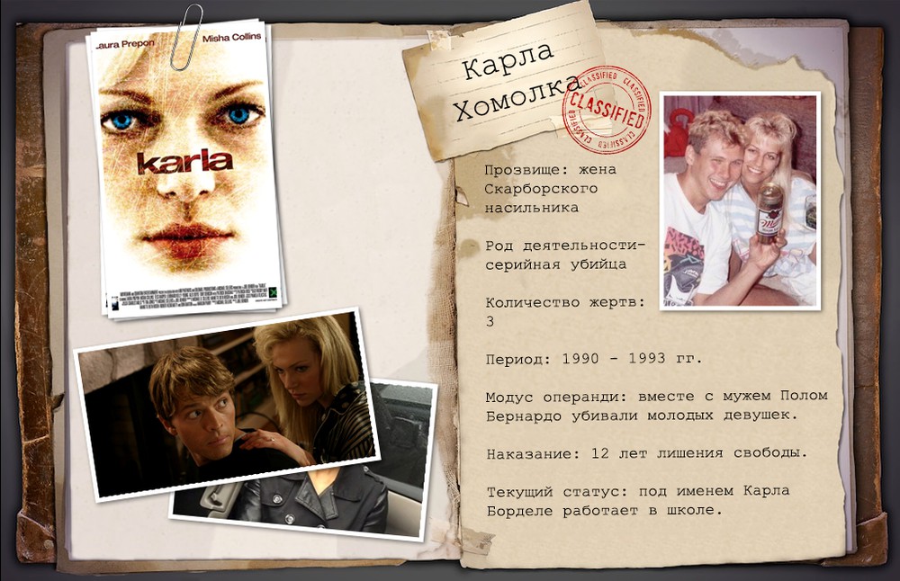 Любовь или одержимость? Пол Бернардо, известный как Скарборский насильник, изнасиловал порядка 30 молодых девушек (от 15 до 22 лет) и убил как минимум ещё троих. Все преступления записывал на видеокамеру. Его жена Карла была соучастницей: заманивала девушек, поила их алкоголем и таблетками. Насиловала и убивала с завидной (нет) жестокостью, что была под стать мужу.