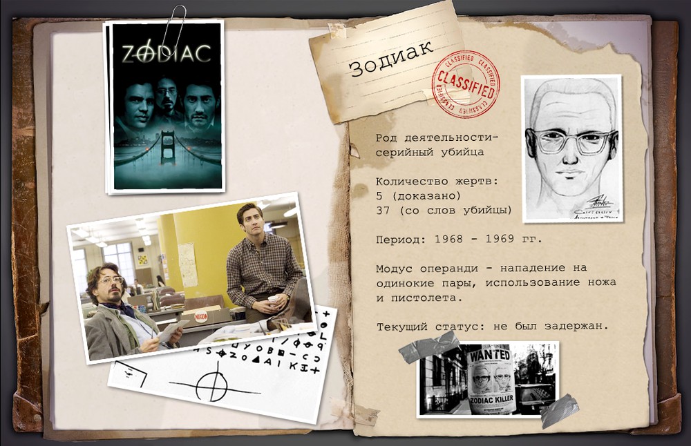 Что бы это ни значило. В любом случае, прошла уже половина века, а отпечатки пальцев, найденные на месте преступления, и точное описание внешности убийцы ни к чему не привели. Где-то там в Калифорнии ещё бродит Зодиак; смотрит про себя сериалы и радуется, как здорово он всех обвёл вокруг пальца.