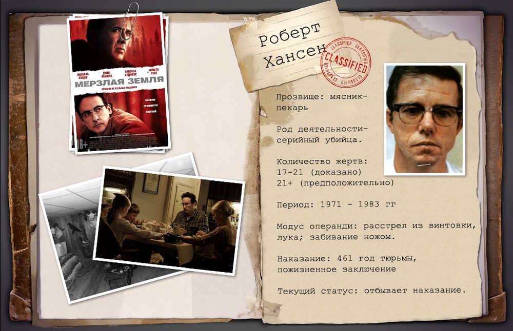 И Джон Кьюсак, и Николас Кейдж в фильме «Мёрзлая земля» предстанут в новых и необычных амплуа. Серийный убийца Роберт Хансен и детектив, идущий по его следу в захватывающей криминальной драме режиссёра Скотта Уокера. Стоит смотреть хотя бы из-за них. А ещё, конечно, из-за Хансена, который в своё время убил около двадцати девушек, прикрываясь при этом личиной добропорядочного семьянина.