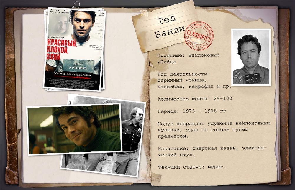 Мне, как давнему фанату тру крайма, и тому, кто знает практически всё о практически всех серийных убийцах (говорю на киллерском со словарём), было интересно посмотреть на историю, показанную немного под другим углом. Понравится тем, кто знаком со статьёй из Википедии. А тех, кто о Банди не знает ничего, может запутать.