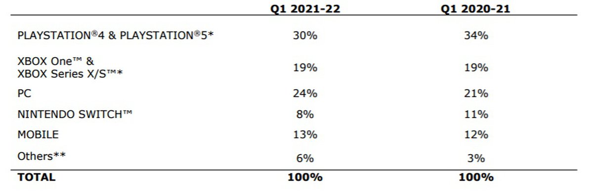 По платформам впереди PlayStation двух поколений (суммарно 30% продаж). Второе место у PC (24%), затем идет Xbox (19%), мобильные платформы (13%) и Nintendo Switch (8%). Примечательно, что по сравнению с прошлым годом доля PlayStation и Switch снизилась, а PC и мобильных платформ — подросла.