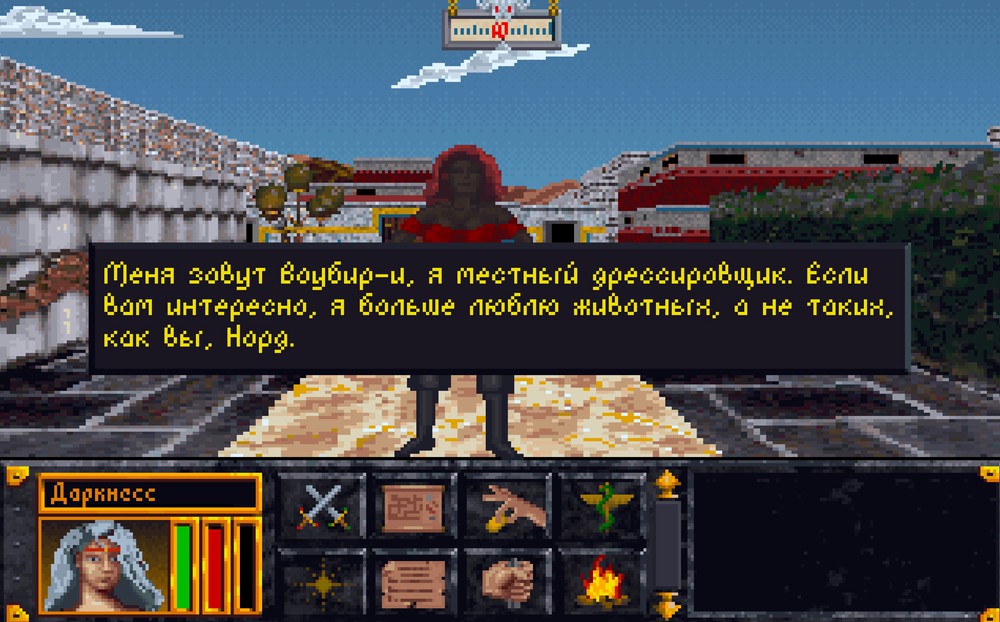 Если зорі на небі совпали удачно, то мы всё-таки проходим первое подземелье и телепортируемся где-то на окраине Магнитогорска, любуясь восхитительными пейзажами, что генерируются метра за три перед главным героем. Дальше всё происходит по нехитрому алгоритму, повторять который приходится постоянно: спрашиваем любого мимокрокодила о интересующих нас вещах и он выдаёт нам всю подноготную, вместе с номером кредитной карточки и двумя фотографиями в анфас. Остаётся только добежать до нужного места и проделать всю эту магию снова, не забыв умереть в подземелье от столбняка. Всё.