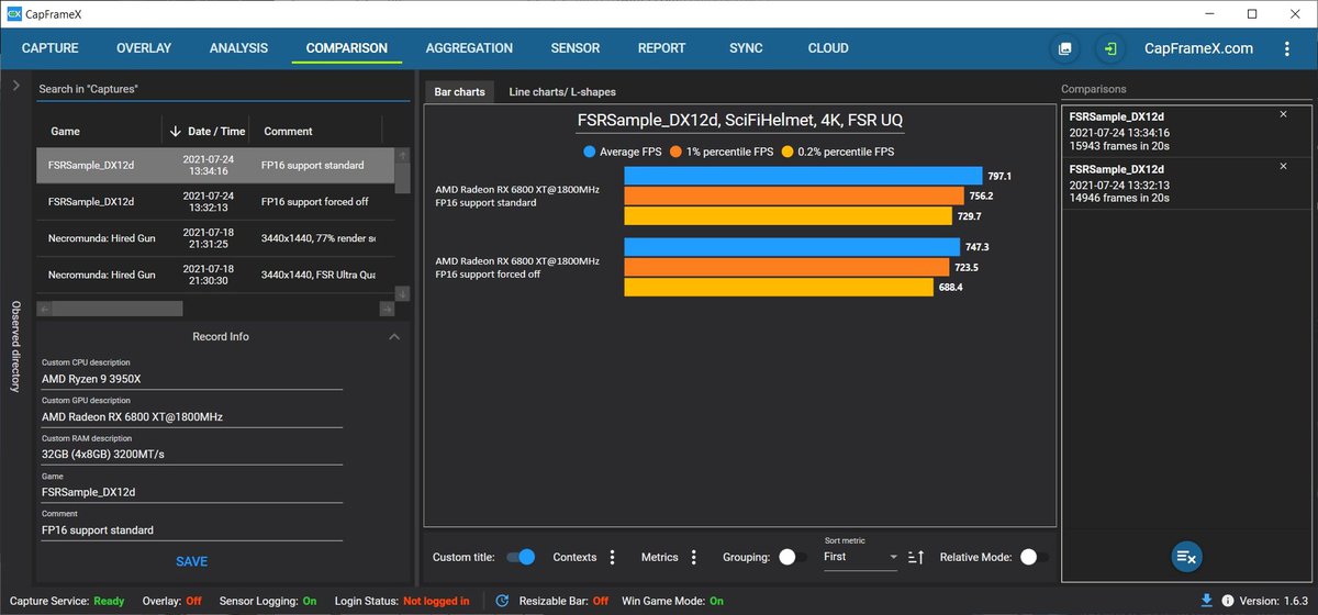 Сравнить производительность с FP16 и FP32 удалось благодаря открытию исходников FidelityFX Super Resolution. Команда CapFrameX сперва протестировала FSR на Radeon RX 6800 XT, а затем вручную отключила поддержку FP16 и провела тесты еще раз.