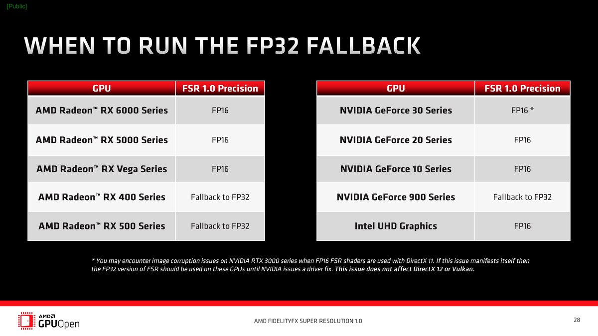 FP32 вместо FP16 используется при работе FidelityFX Super Resolution на видеокартах Radeon RX 400 и Radeon RX 500. Также вычисление с числами половинной точности не применяется при работе с GeForce GTX 900 серии.