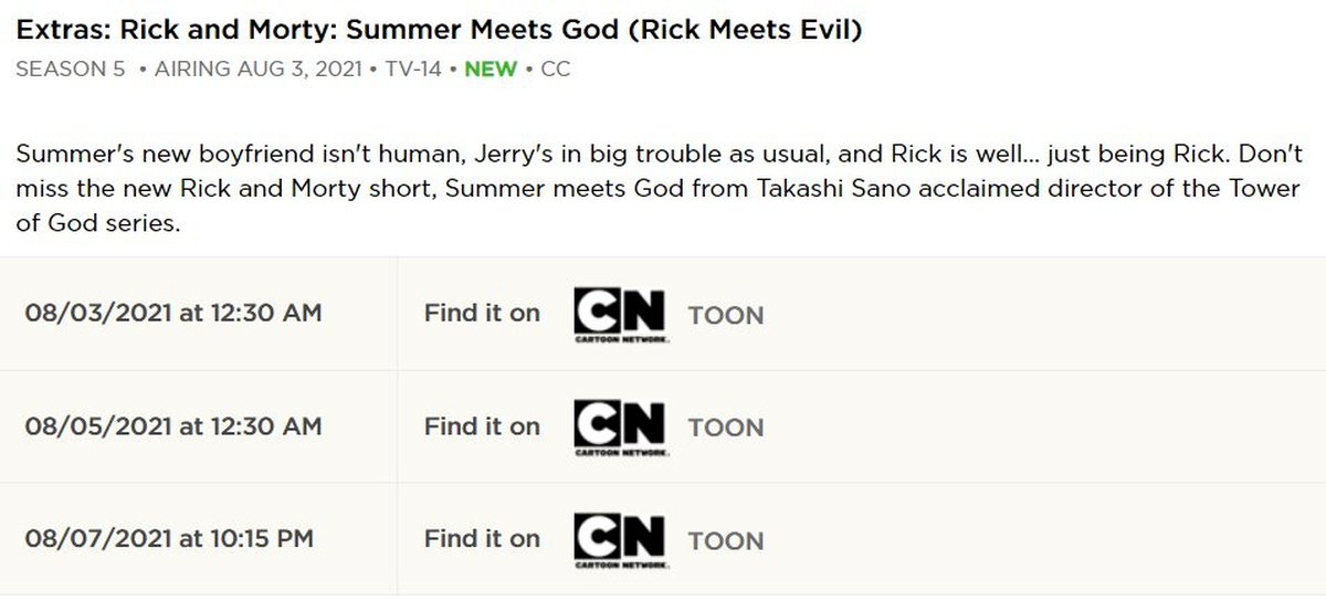 Премьера третьей короткометражки по «Рику и Морти» состоится 3 августа, утверждает swimpedia со ссылкой на расписание канала Adult Swim. Эпизод под названием Summer Meets God (Rick Meets Evil) выйдет в 07:30 по Москве.
